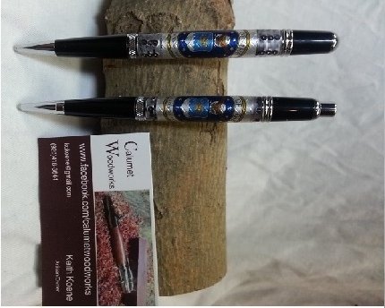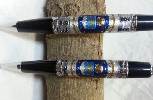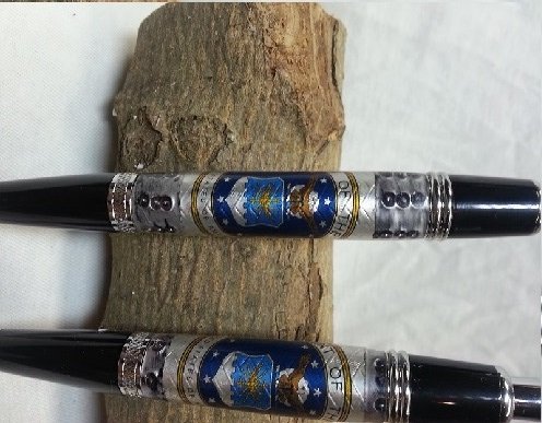 I was honored with a request to make a pen and pencil set for a young man receiving his commission in the AF this May. His parents wanted something "manly yet classy". Pretty sure these fit the bill. I got the blanks from a vendor on Etsy. I did have to trim down the pencil blank as that tube is bit shorter than the pen. Kits are Sierra from Exotic Blanks.