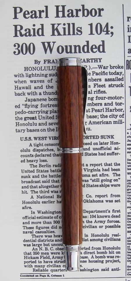 This pen was crafted using teak wood for the deck off the battleship USS California (BB-44) that was sunk at Pearl Harbor. The ship was refloated and dry-docked at Pearl Harbor for repairs. On 7 June, she departed under her own power for Puget Sound Navy Yard where a major reconstruction job was accomplished, including improved protection, watertight compartmentalizing, stability, antiaircraft battery, and fire control system.