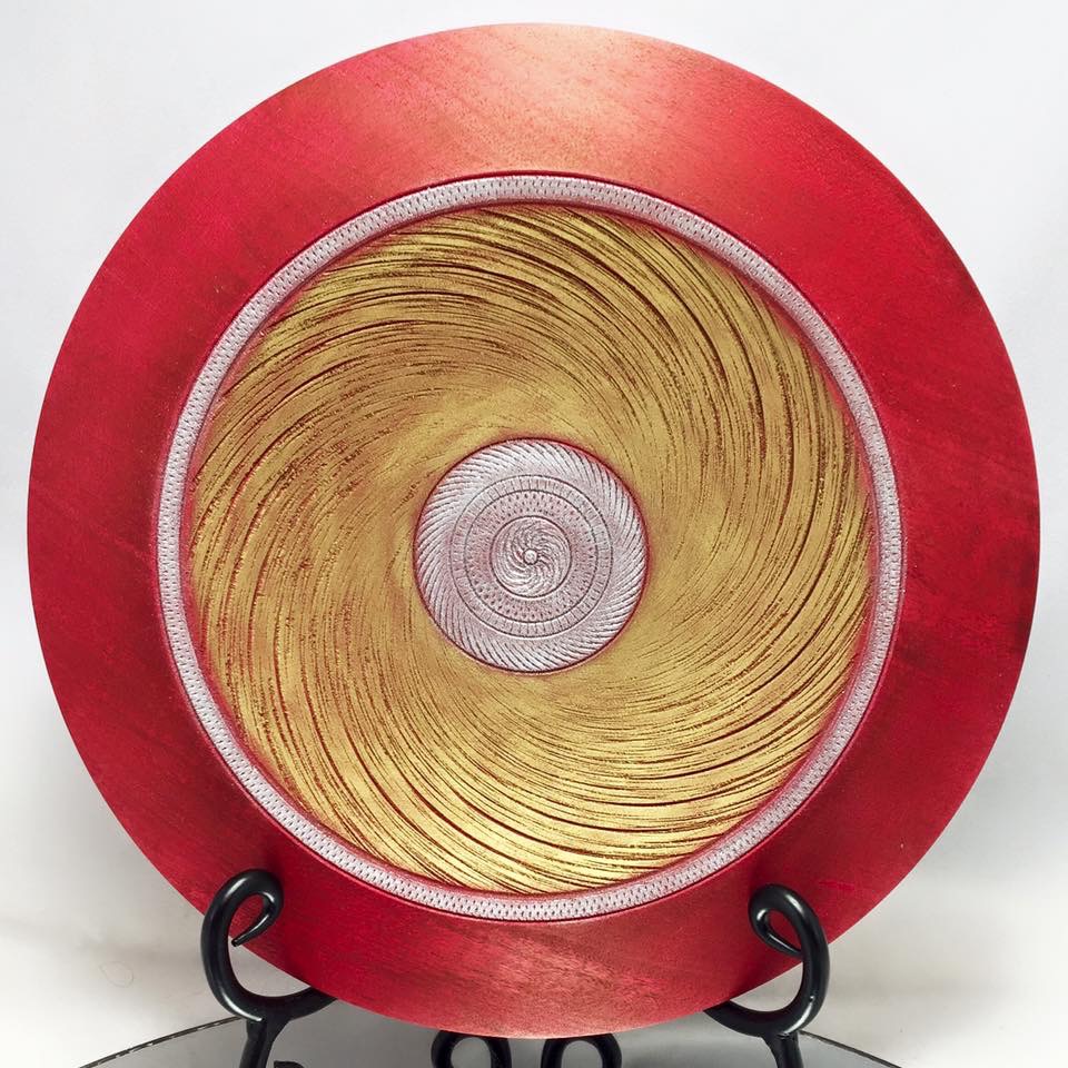 Maple bowl, 9.5 inches diameter. Turned, dyed, textured and gilded. Dye is applied with an atomized and gilding with a dry brush technique.