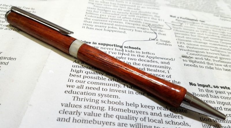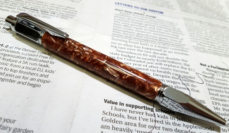 Seldom do I post pens. I don't turn that many pens as I just give them away. Also the neuropathy in my hands is a little bothersome as I can no longer write cursive and I draw all my letters. However, The Vertex click pen is my favorite. Have made quite few. The first photo is the Vertex and the second is my carry pen. The slimline is not a great looking pen but one of the very first pens I made. The only reason I show it is the shape at the nib. I do not like the shape of the Sierra style pens as my fingers slide toward the nib. I make all my slimline and other slender pens with a slight flair.