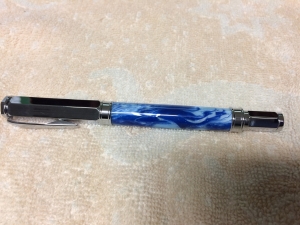 I have to say I like making these kits. They're a simple one barrel design with only two couplers that press in easily. I don't care much for the hexagonal shape but it keeps the pen from rolling off your desk as long as the cap is on or posted, although I don't post the cap myself. I cast the blank this weekend with opaque blue dye that I added a touch of House of Kolor white ice pearls to, the other color is sky blue mica with nothing added. I painted the tube white which really shows through and drilled the blank then set it aside.