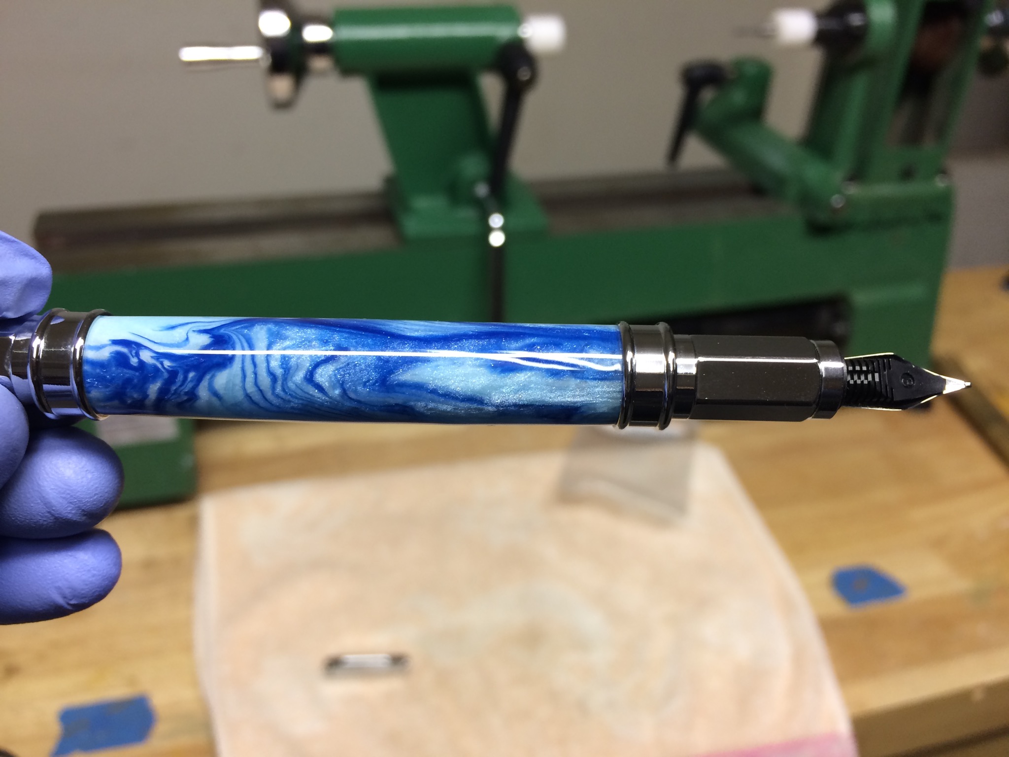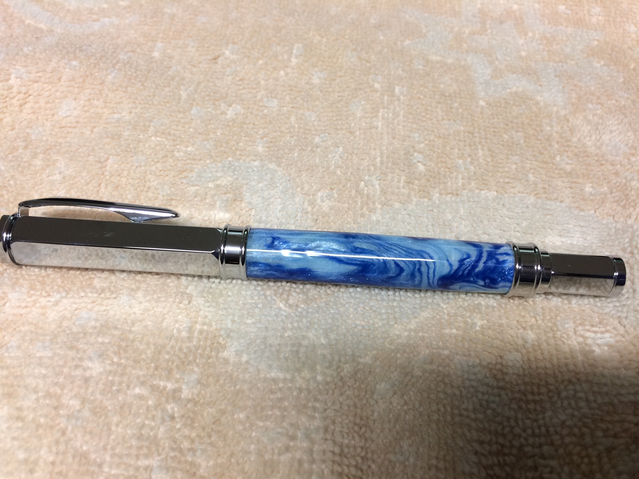 I have to say I like making these kits. They're a simple one barrel design with only two couplers that press in easily. I don't care much for the hexagonal shape but it keeps the pen from rolling off your desk as long as the cap is on or posted, although I don't post the cap myself. I cast the blank this weekend with opaque blue dye that I added a touch of House of Kolor white ice pearls to, the other color is sky blue mica with nothing added. I painted the tube white which really shows through and drilled the blank then set it aside.