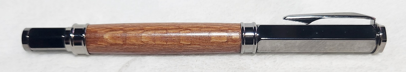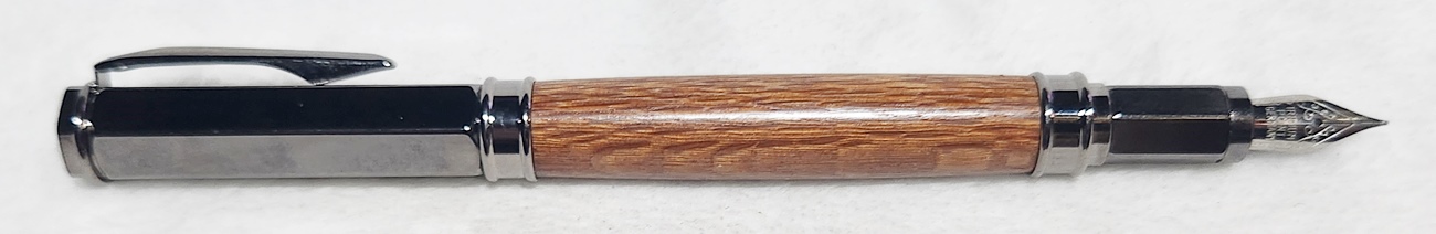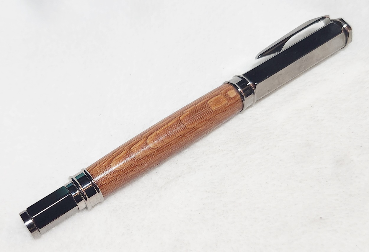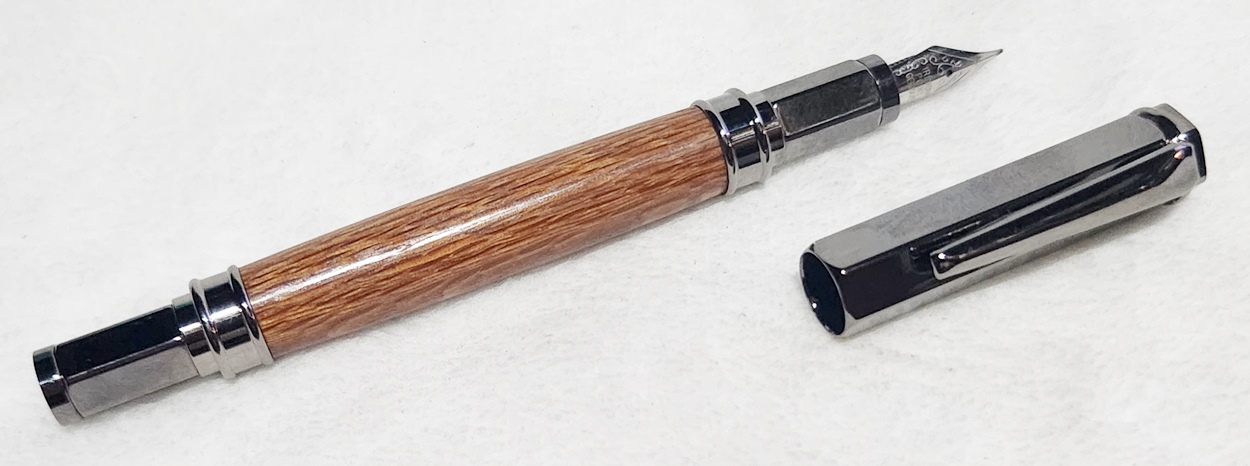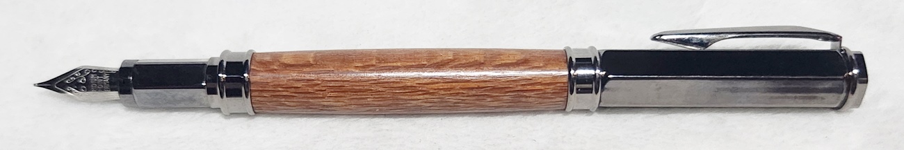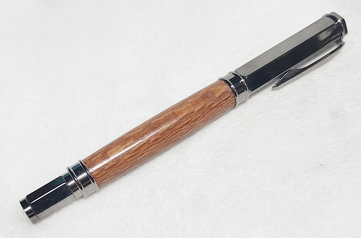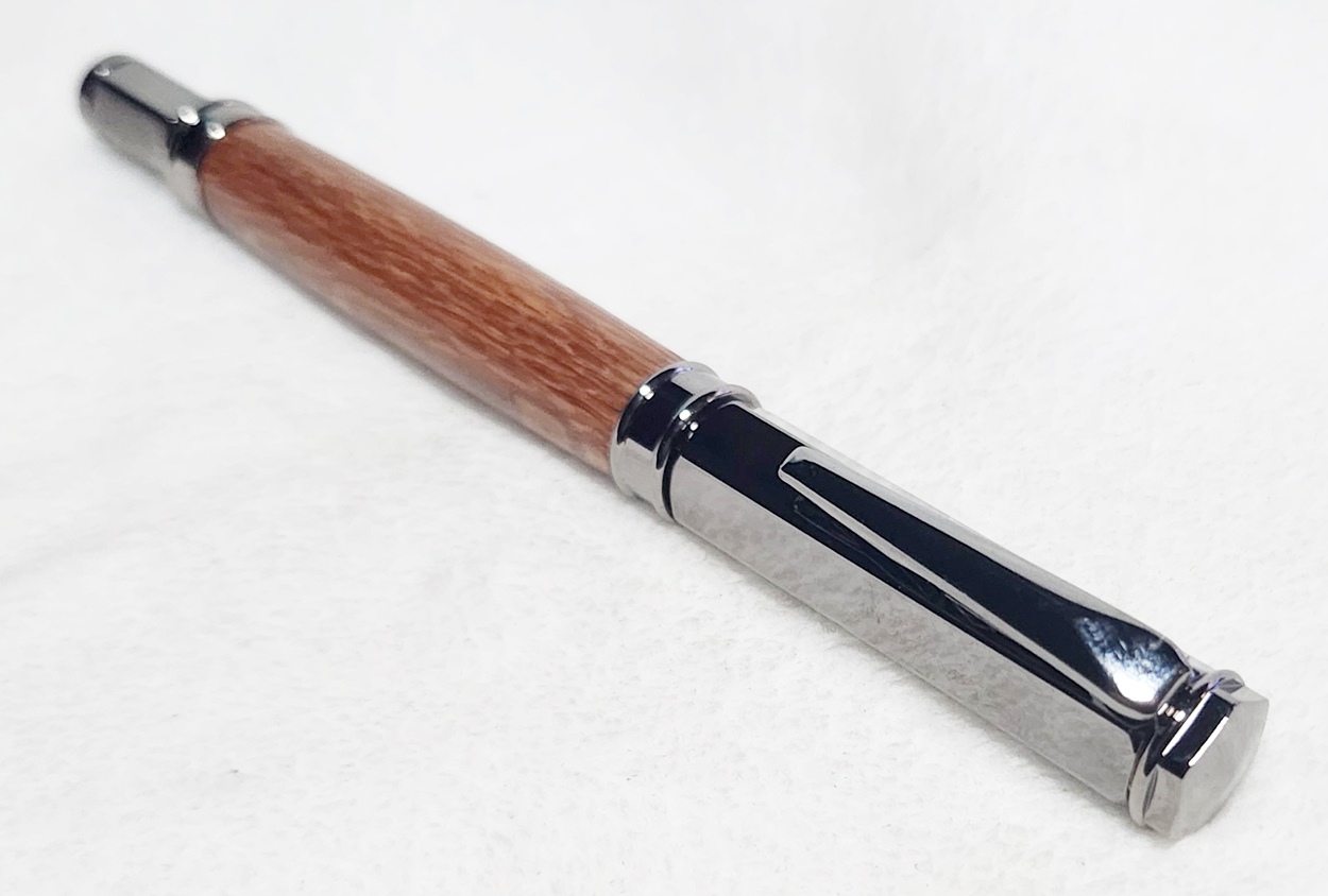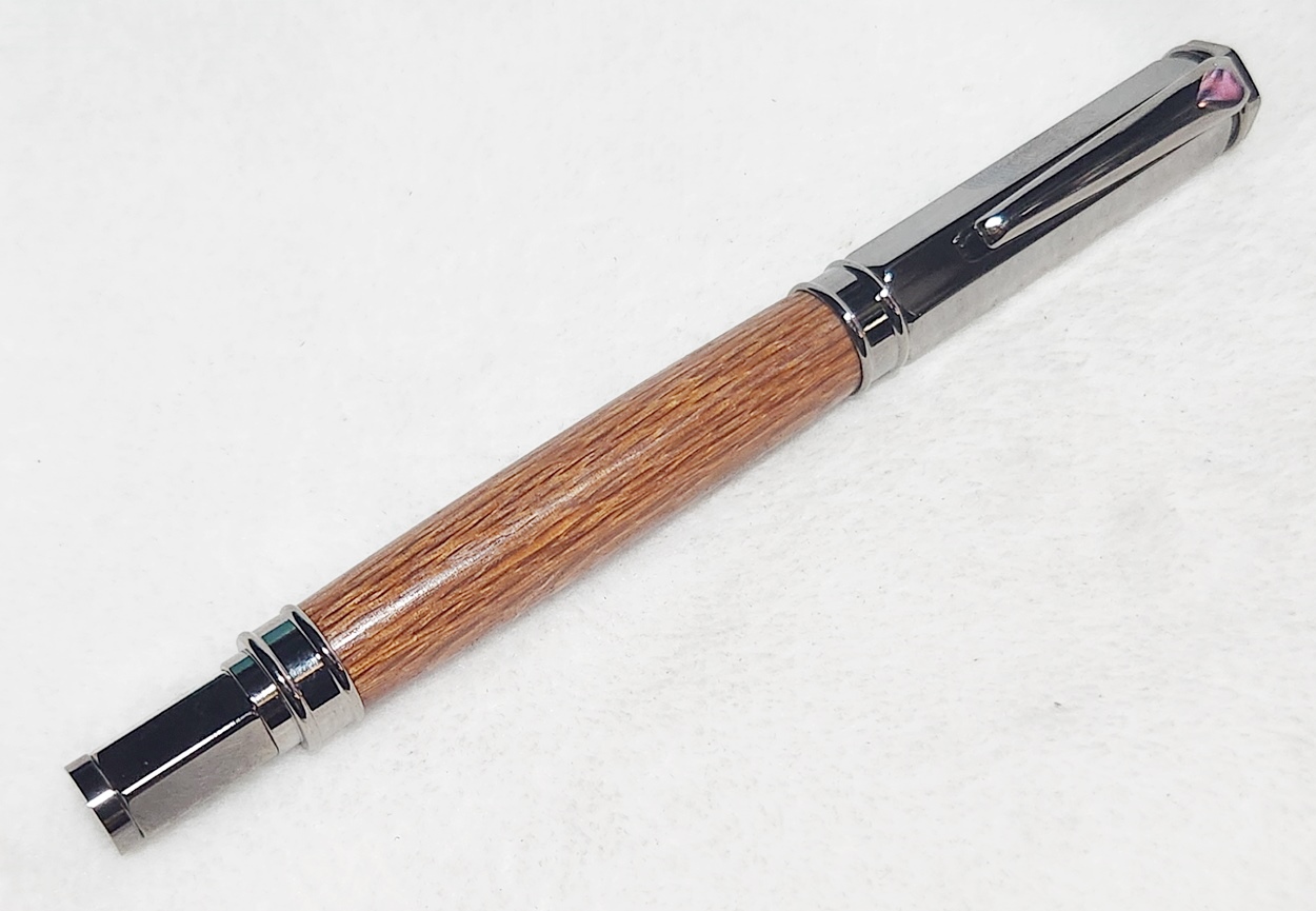 This is a Magnetic Vertex fountain pen in chrome, from PSI. I bought it at Rockler. The wood is leopardwood, also from Rockler. The finish is Pens Plus.