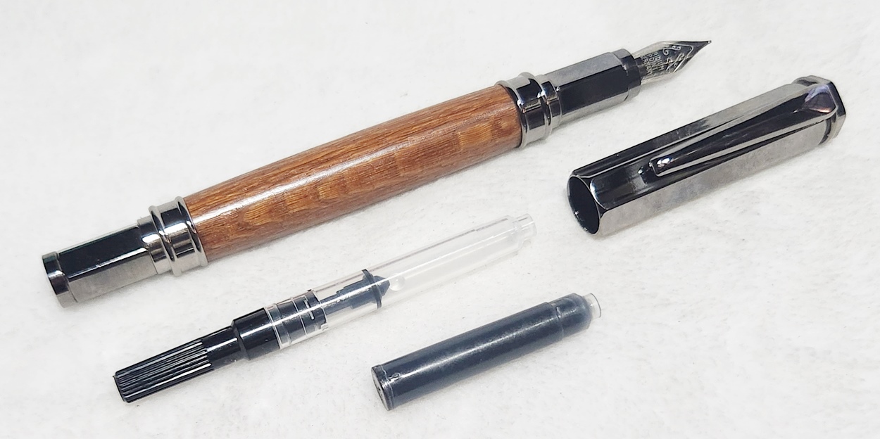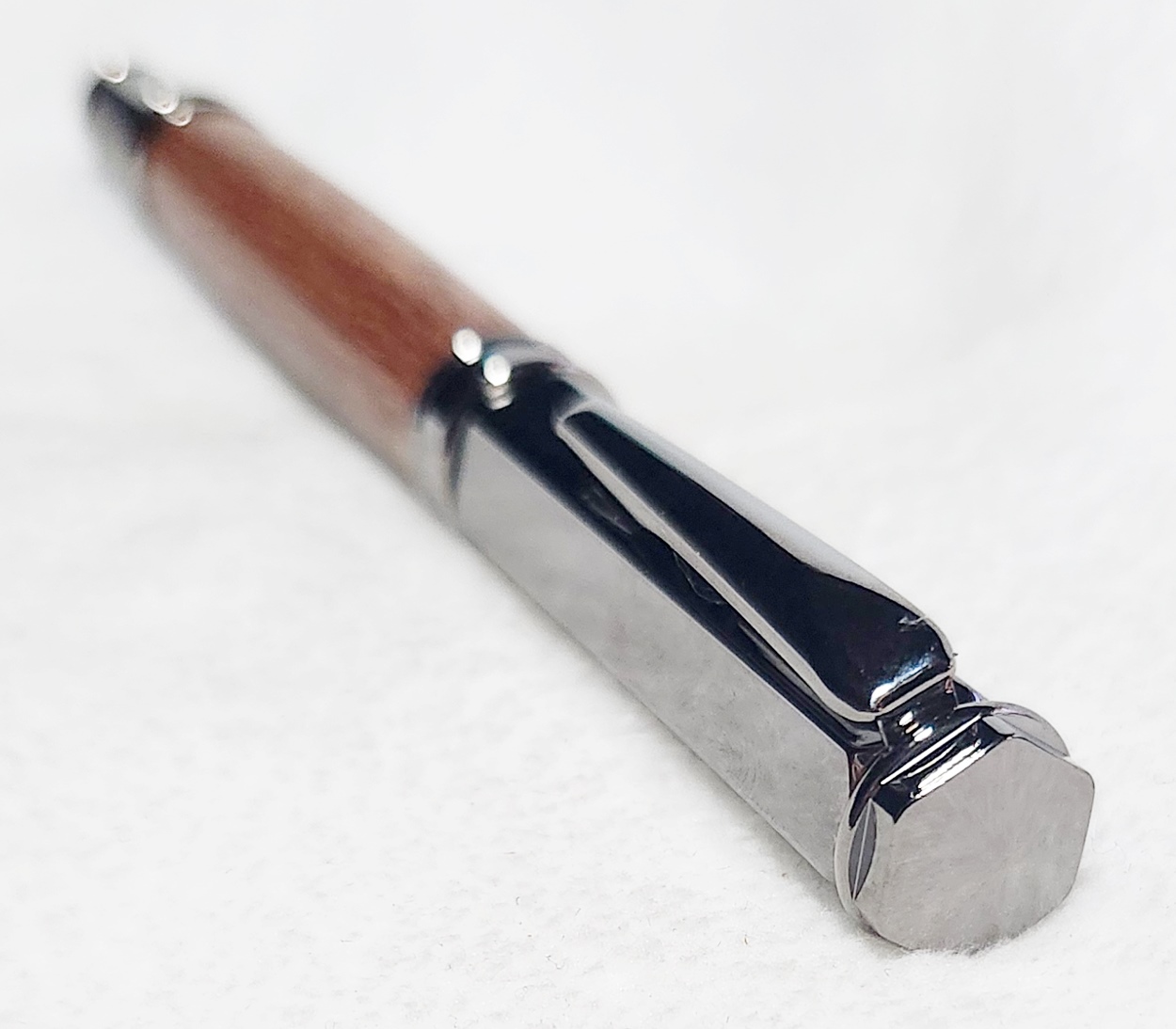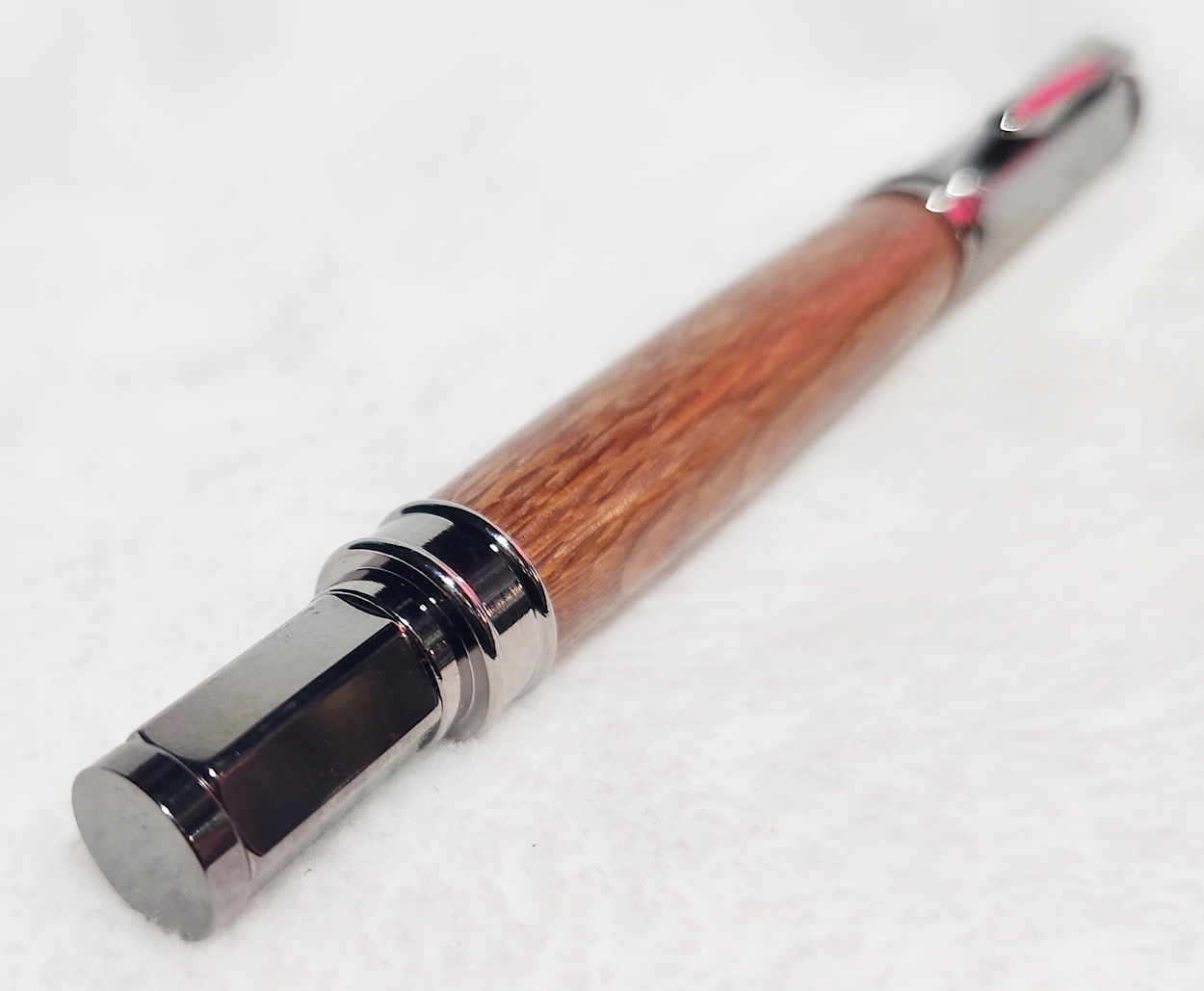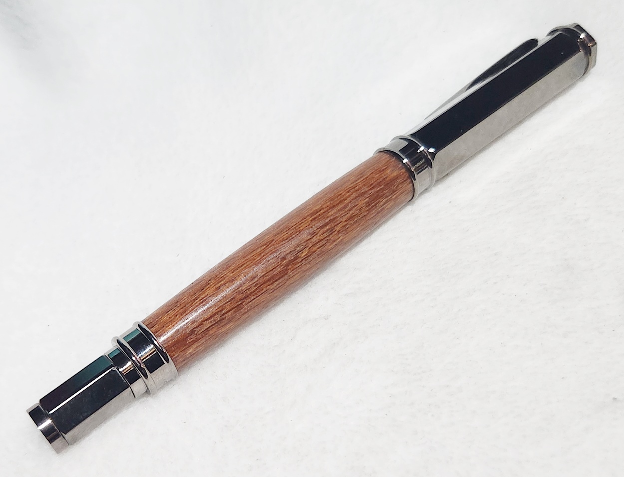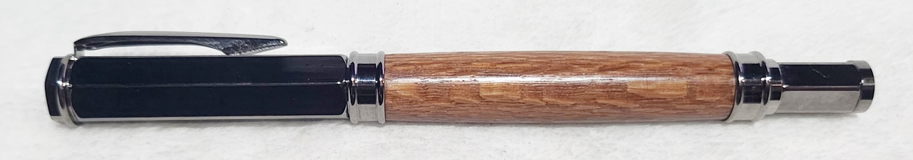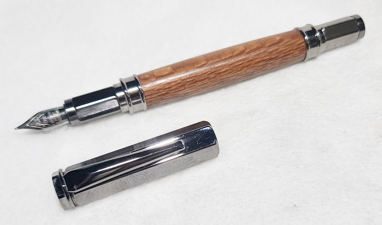 This is a Magnetic Vertex fountain pen in chrome, from PSI. I bought it at Rockler. The wood is leopardwood, also from Rockler. The finish is Pens Plus.