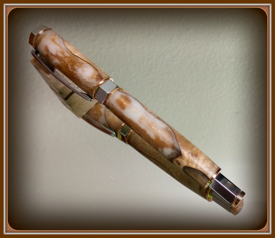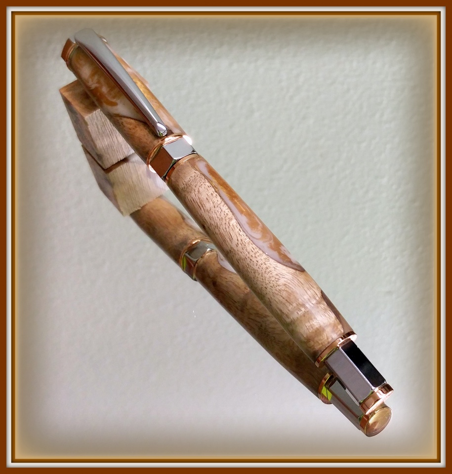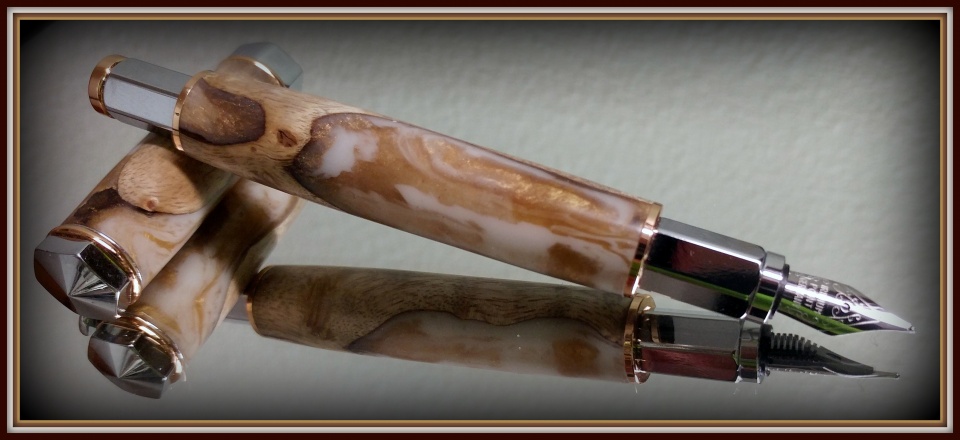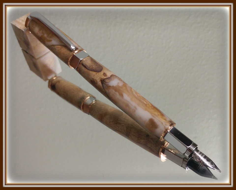 "Rainburl Blank" from Exotic Blanks and a Chrome Vertex Supreme Fountain Pen was today's project. The cap is magnetic so it's quick to pull off, stick it on the pen and get writing. I was surprised when I put it together that it comes with a refillable pump reservoir but no ink. I haven't decided whether to buy a refull or a bottle of ink (which sounds dangerous and sloppy).