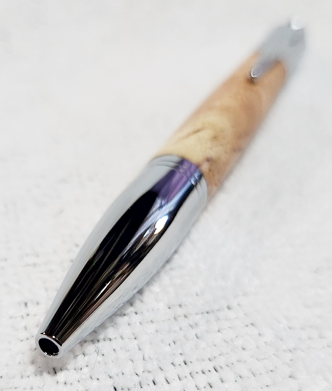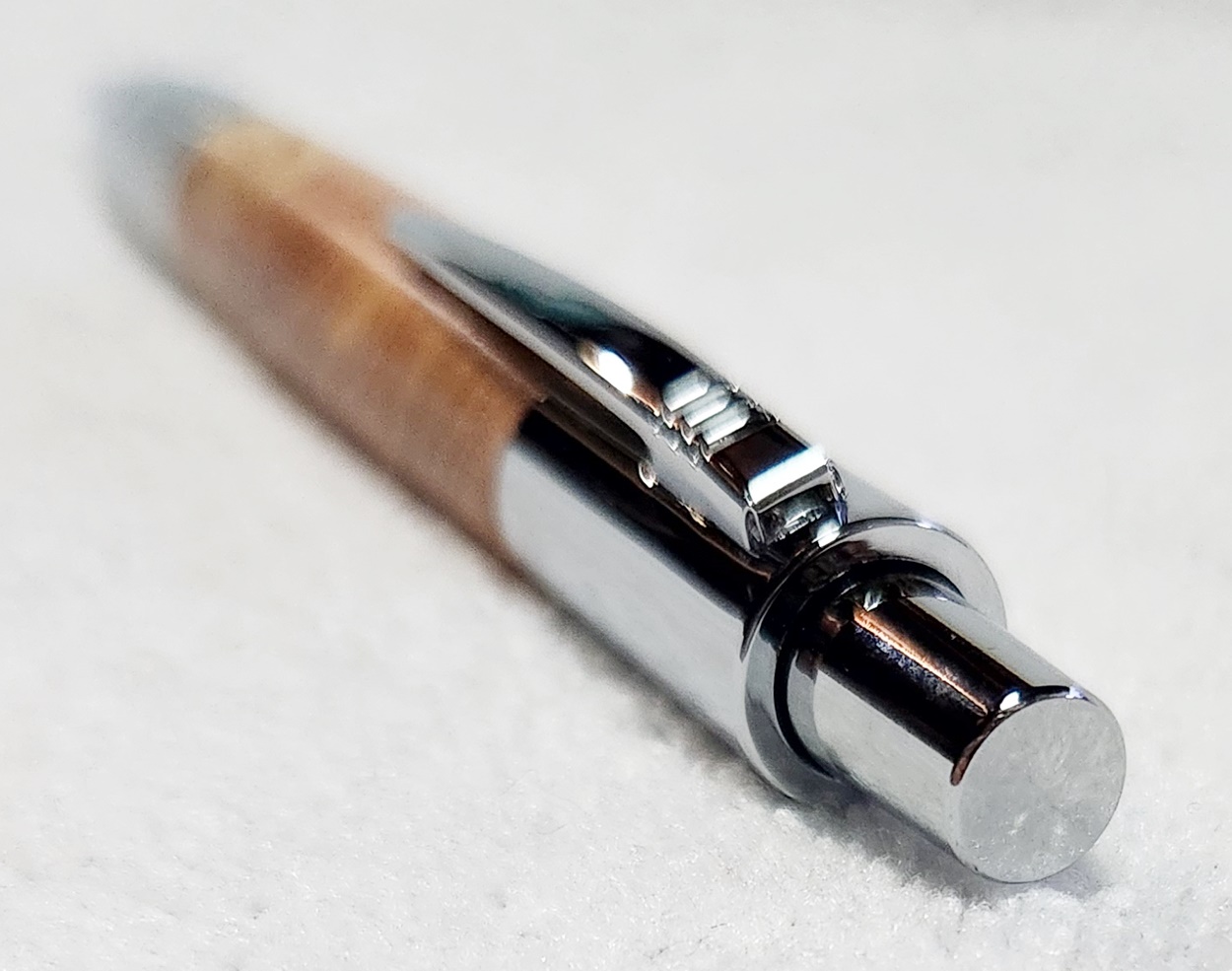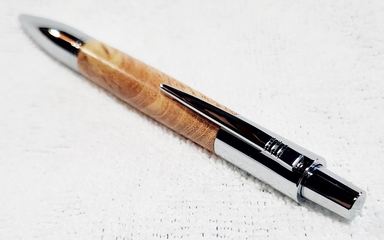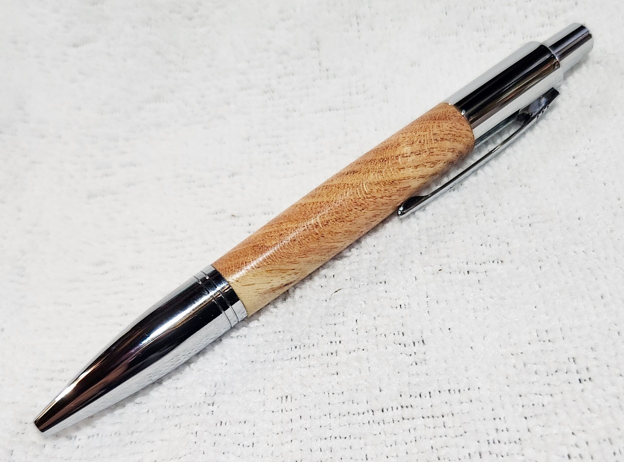 This is a PSI Vesper click pen in chrome. The wood is locust tree burl. The finish is Pens Plus.
