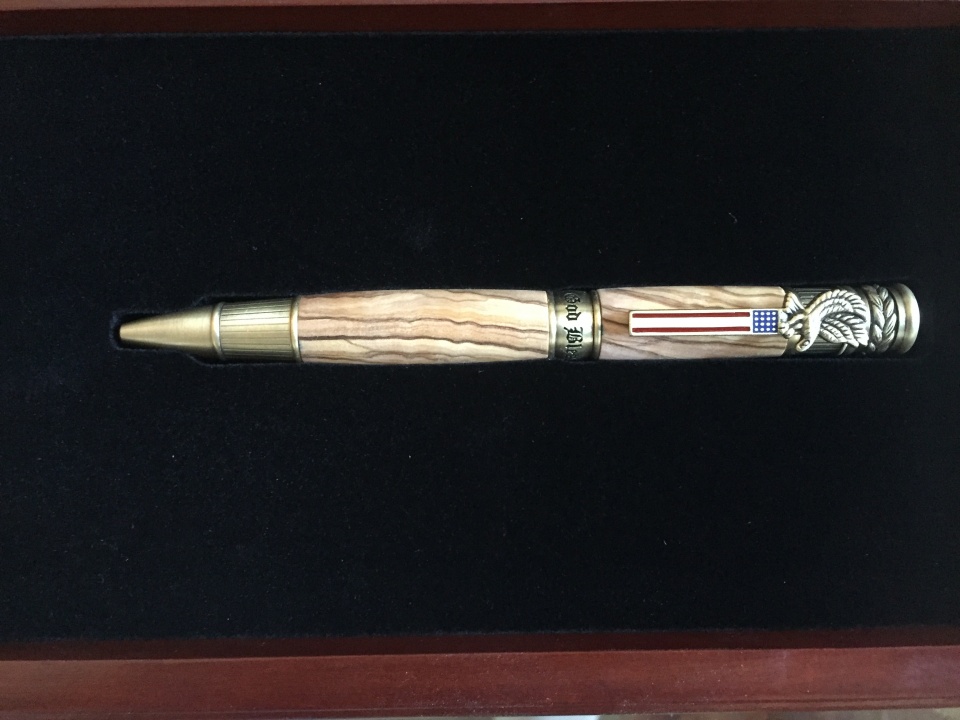 Made this American Patriot pen today for my wife s uncle for Veterans Day. He's a Vietnam veteran. I used Olive wood and plan to have the glass on the display case engraved.