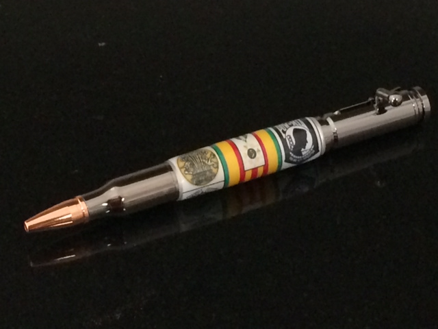 Here's a gunmetal bolt action pen made with a Vietnam Campaign Ribbon blank that Bear Tooth Woods just came out with. The pen is a gift for a friend of mine that did several tours in Vietnam.
