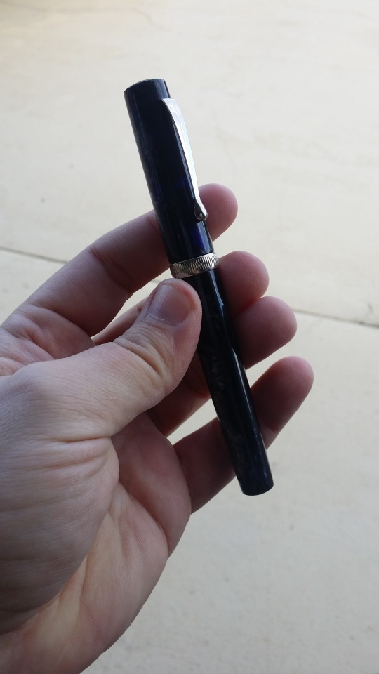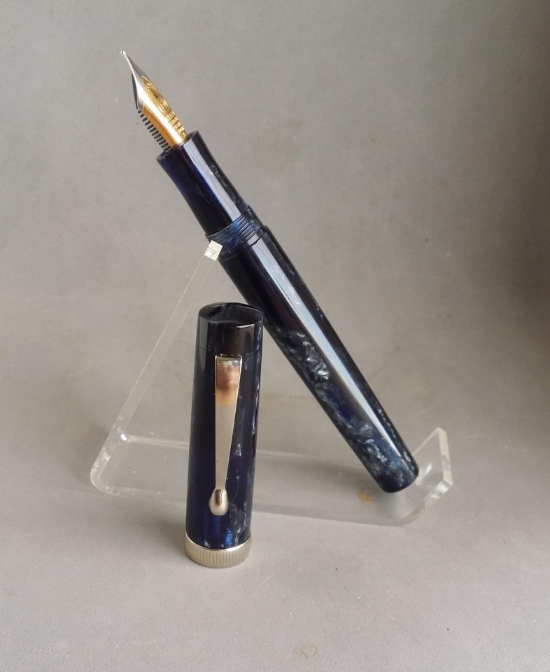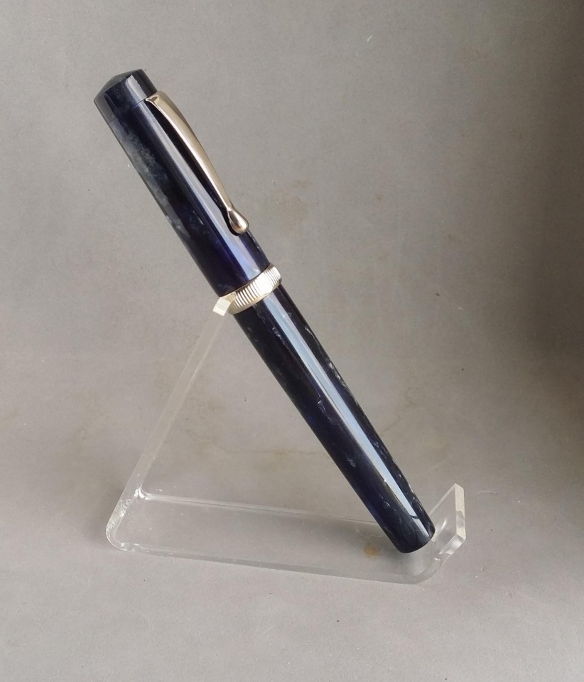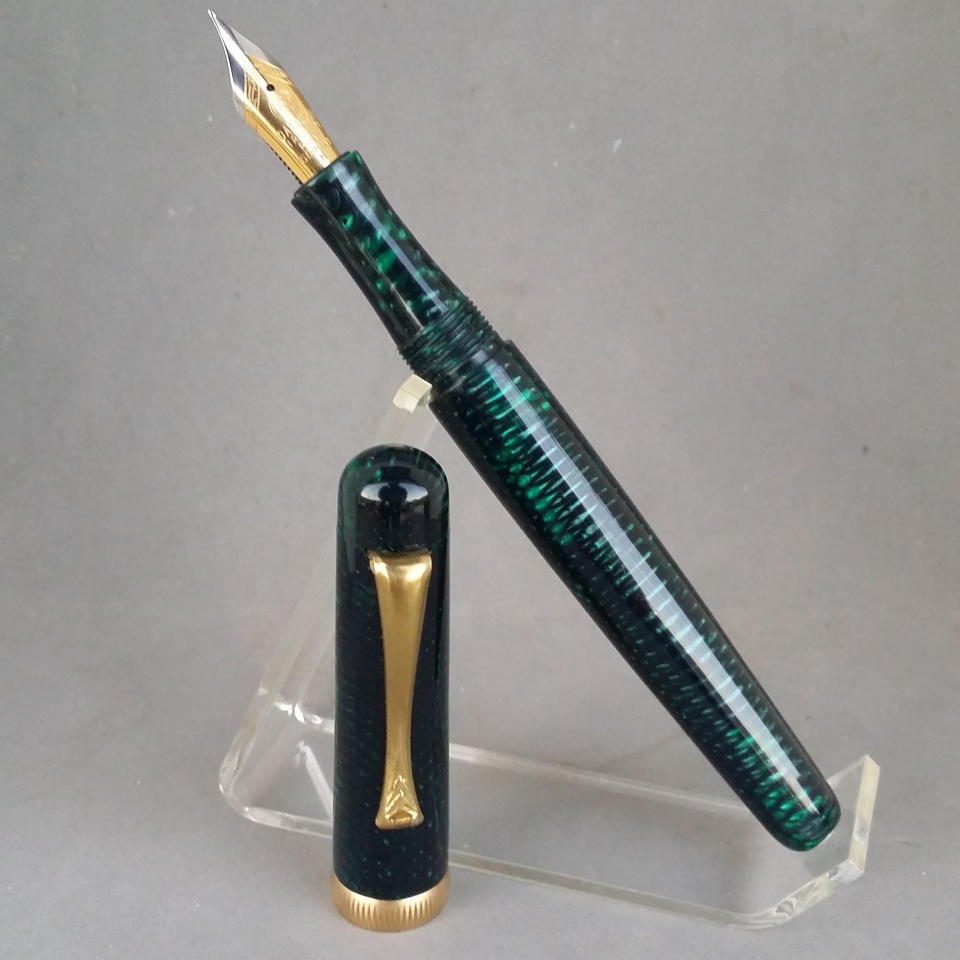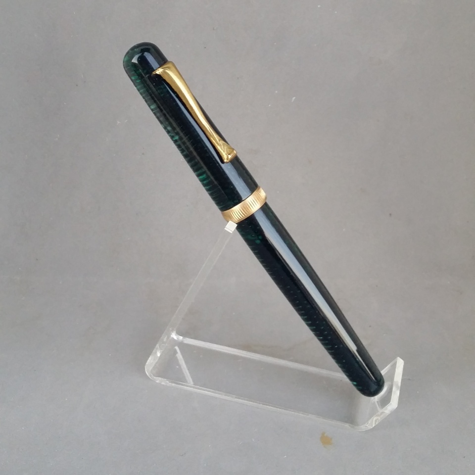 This one came from a really cool material I had never seen before. It's a lot like what Parker used on their vacumatics, but it's not quite it. This one's pattern doesn't go all the way around. Still very cool stuff. Paired with gold accents.
