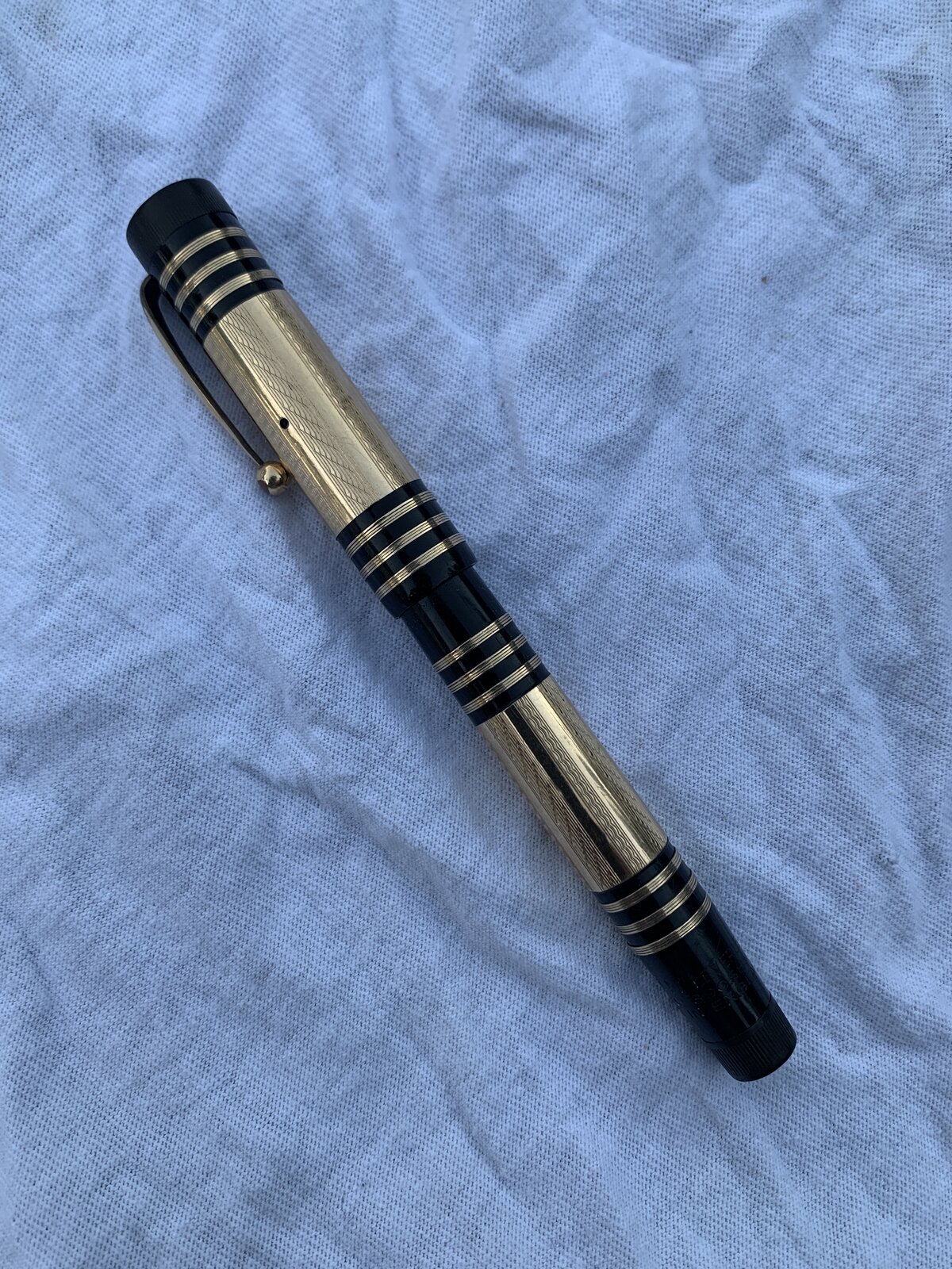 This one was a challenge for me. I really like the 1930's era Mabie Todd Swan which inspired me…though I maybe made the process a little tougher than I should have. The metal is 7075 aluminum, which I used because it was free, but which is pretty tough stuff to mill. The black parts are ebonite.