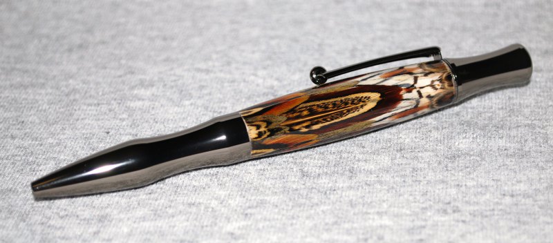 I received a my order from Exoticblanks a few days ago. Inside were a free group of Virage kits and a note from Ed saying he thought the gunmetal would look good with feathers so I should try them with some feather blanks. They couldn't have come at a better time since Ive been working on some new style feather blanks. I decided to turn one of the slightly changed ringneck pheasant with a white feather background. I liked it so much I decided to keep it.... and did so for about 15 minutes until the LOML entered the room and claimed it as her new pen. (lol) Thanks again Ed! All comments welcome.