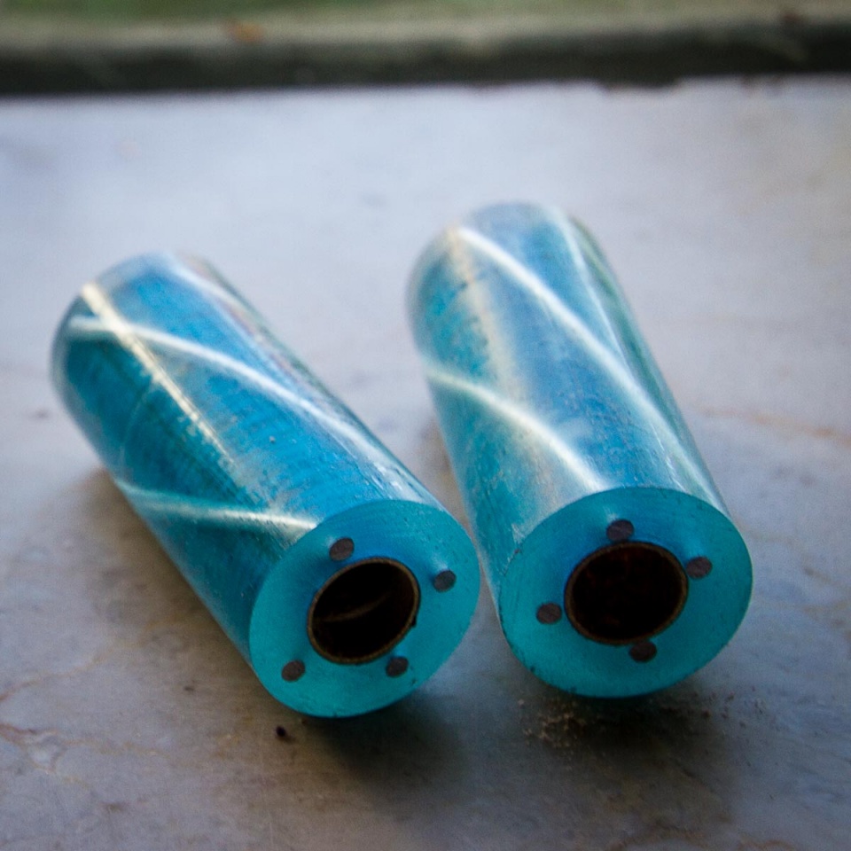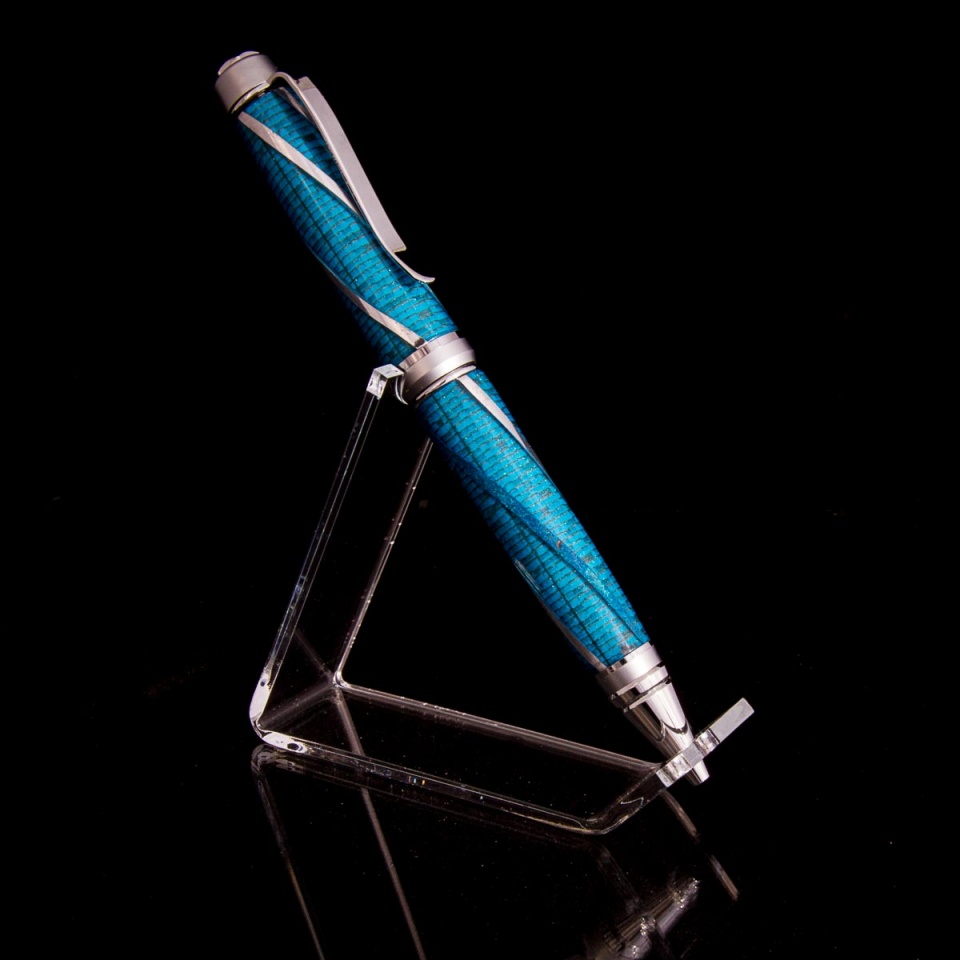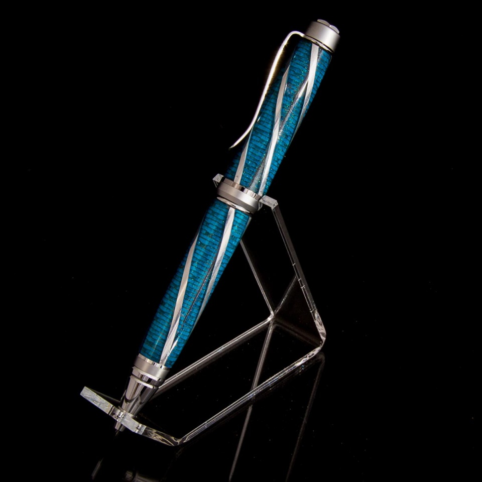 I was struck by a recent Visconti Metropolitan I saw and it got the design juices flowing thinking about how that style could be done with humble basement pen turning equipment... I guess you could call this a prototype in that there were too many unknowns to expect it to work out on first attempt. It's got some issues, the biggest of which is one of the metal strips pulled away and I backfilled with some mica just to finish to see what it would look like. I think I'll try one more round of refinements to my approach and try another to see if I can get one closer to perfect.