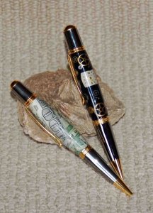 Got these from Bruce (The Mad Resin Mixer) yesterday and could not sit still … went straight to the lathe and turned them. The steampunk is on a Sierra Vista Black Titanium/Gold Titanium from Arizona Silhouette and the $ on a Gold Titanium & Black Titanium Sierra from timberbits. I left the $ blank 'larger' than I normally do … thought it might magnify the blank a bit better …