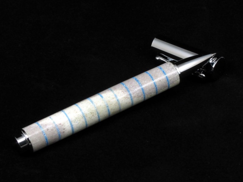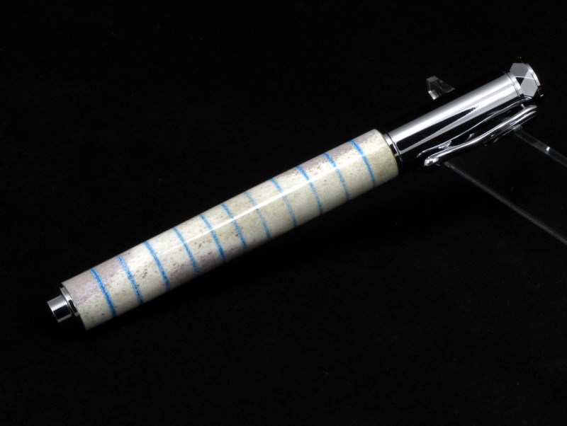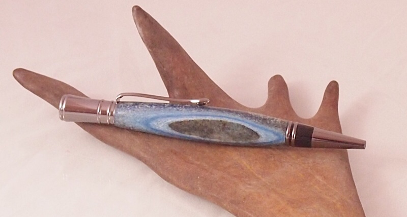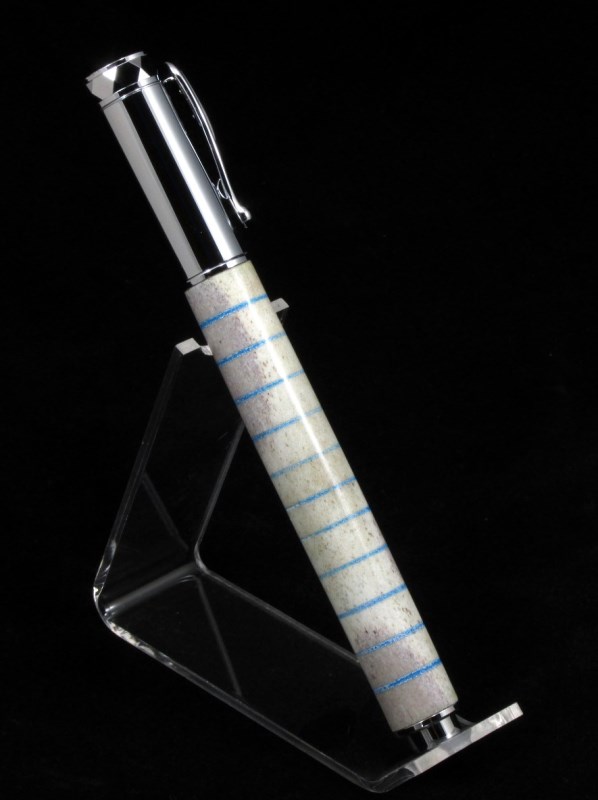 #6 - The pen is comprised of chrome Zen rollerball components matched with a whitetail deer blank. The length of tube provide for great variations in coloration throughout the blank. I added on 11 blue bands in honor of the IAP's 11th anniversary.