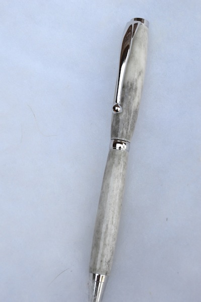 #4 - This is a slime line deer antler pen. The plating is Rhodium and I used a fairly thin piece of antler because the 7mm tube size is often not enough to get through a larger blank's inner core (too soft). It is finished with 4 coats of thin CA and sanded/buffed to give it a shine.
