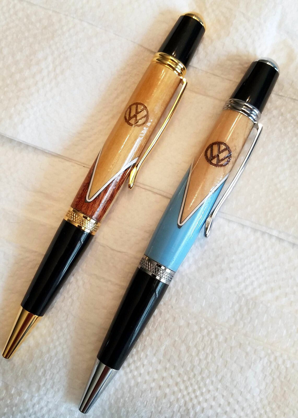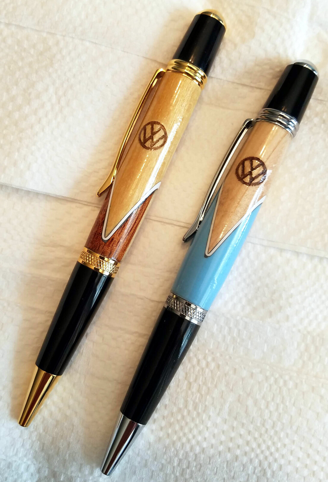 A few weeks ago I asked for suggestions on a VW themed pen. Thanks you to those of you who made suggestions and offered help. Thanks especially to JohnU who gave me the idea that I went with. It only took me about a half dozen tries before I got something I'm fairly satisfied with. The last test blank is on the left and the one I will send is made with rhododendron, hotel pass card, a Gisi BWB strip and blue PVC pipe. The VW Logo is laser engraved. The pens are not for sale and are a gift to a VW enthusiast.