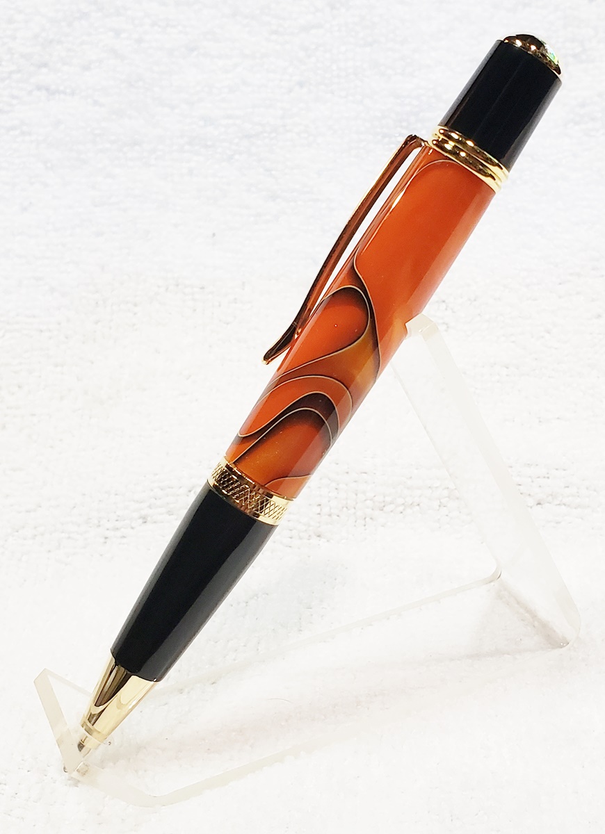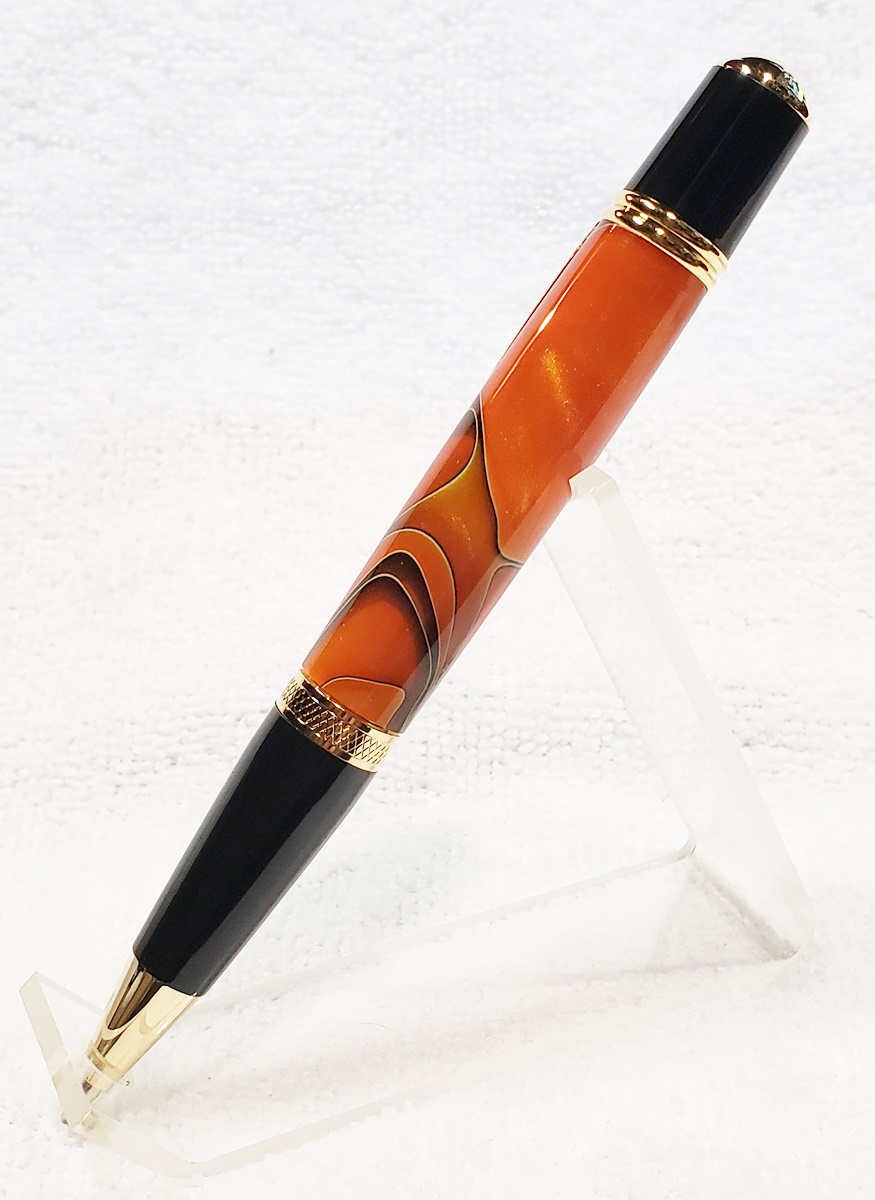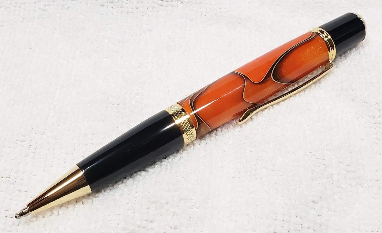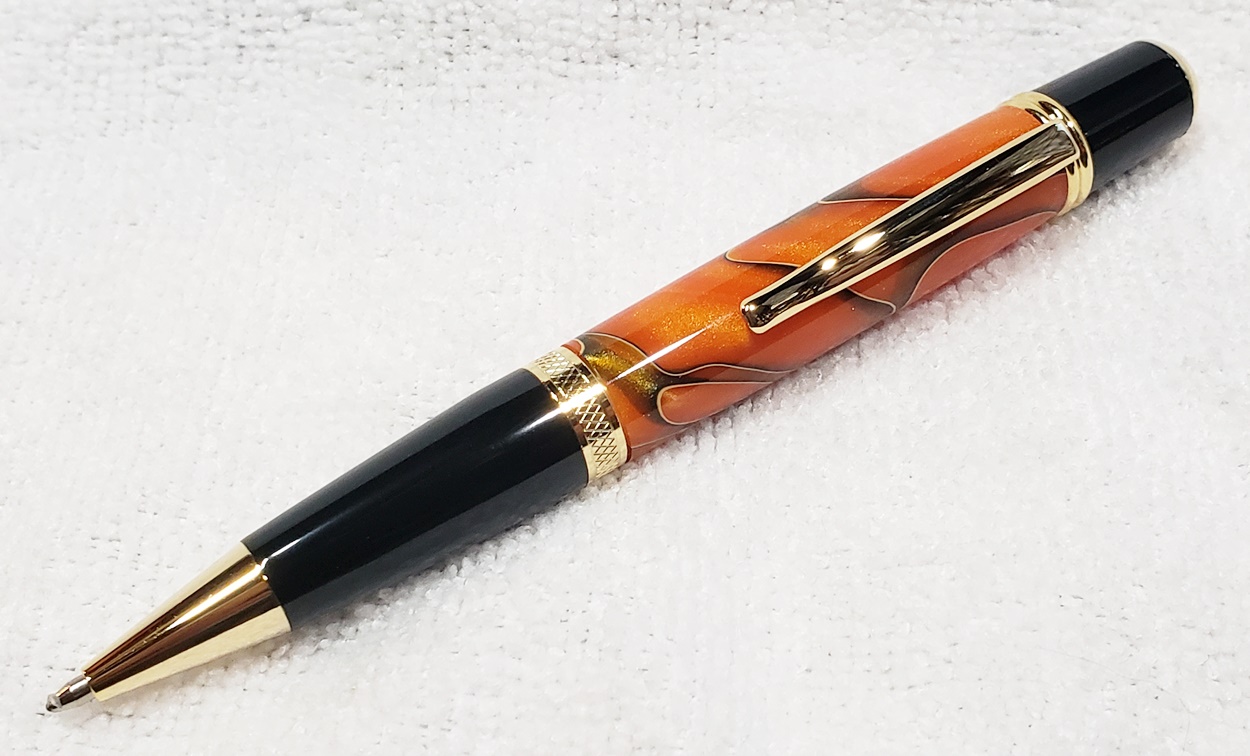 I made this for a friend of mine, whose favorite color is orange. The pen is a Wall Street III in gold, from Woodcraft. The blank is called Tie Dye, and is also from Woodcraft. I really like the blank. Very happy with this.