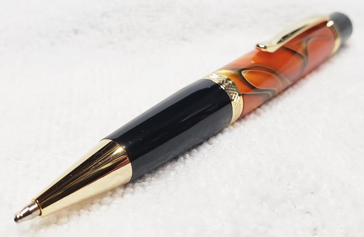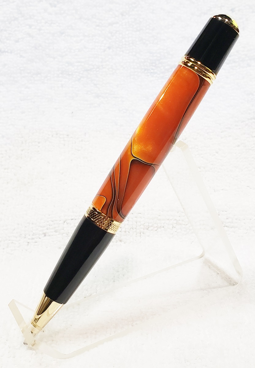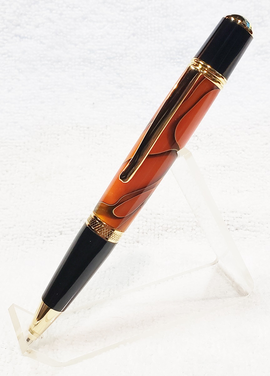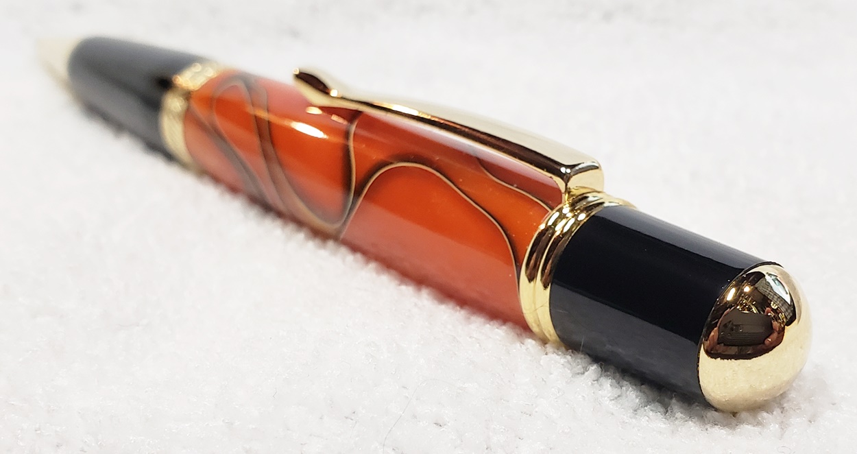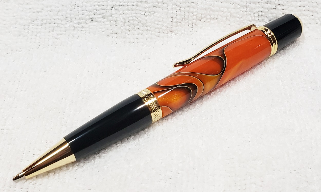 I made this for a friend of mine, whose favorite color is orange. The pen is a Wall Street III in gold, from Woodcraft. The blank is called Tie Dye, and is also from Woodcraft. I really like the blank. Very happy with this.