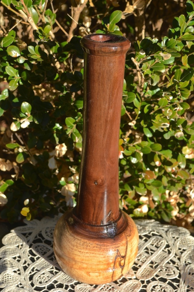 Well, here's the story. A friend gave me his chunk of walnut but as you can see there was a large gouge. I didn't know what to do with it so I tried a vase - about 12 " tall. The neck is where the gouge was and the bottom ended up being spalted and cream. A nice contrast. Not sure I like the shape but it turned out rather interesting - don't you think? As always - c & c welcome!