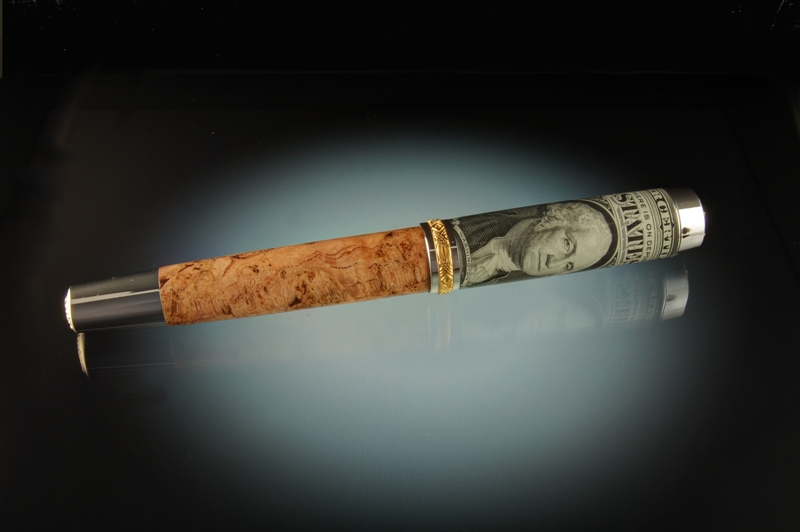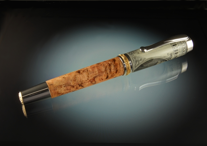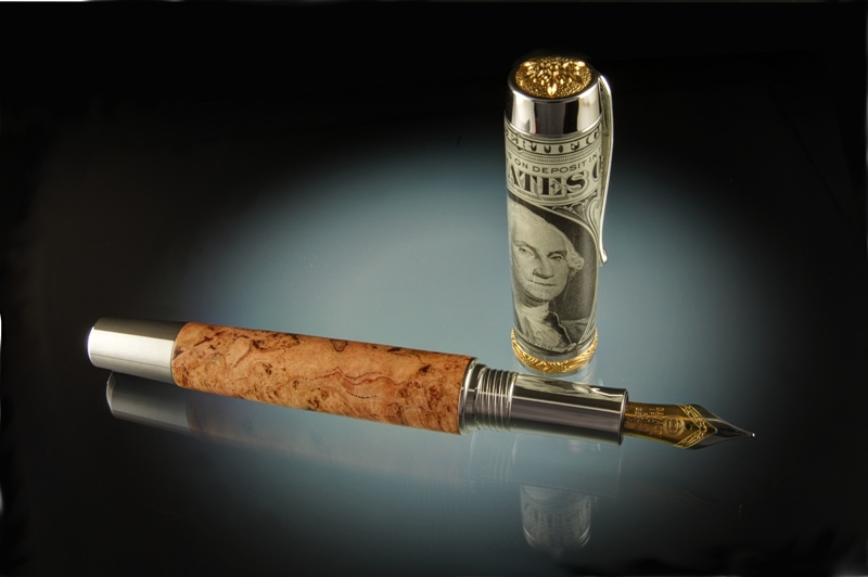 I cannot tell a lie - not an original idea, but I loved the concept so I finally made it. I tried multiple searches to give credit to my inspiration, but no luck. Thanks to Seamus for a flawless casting of my tube. Went with a real 1957 Silver Certificate and a nice piece of cherry burl. Was going to swap out the nib for a Bock, but it writes so well I think I will leave it for now.