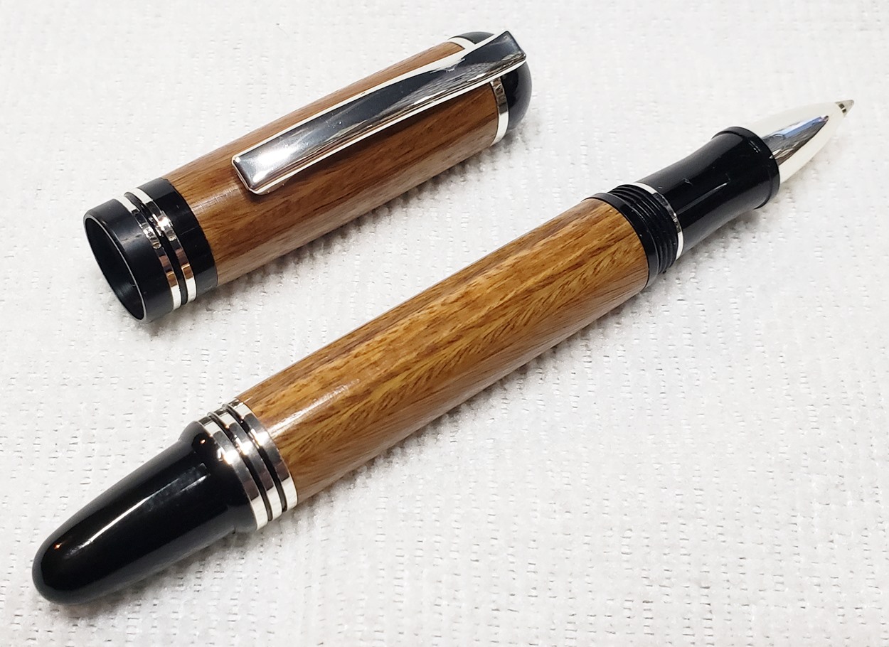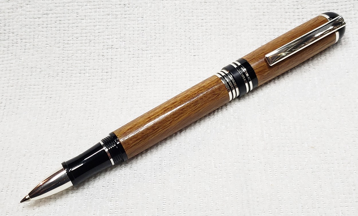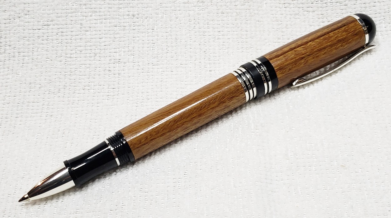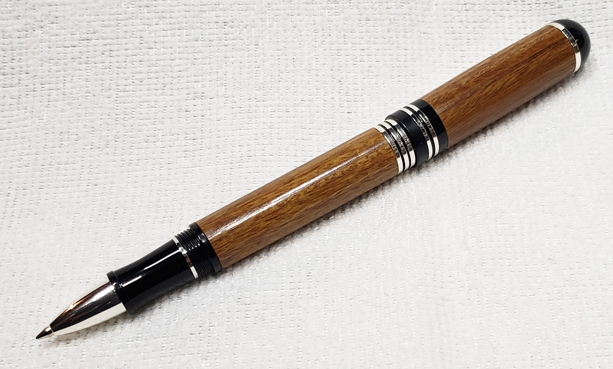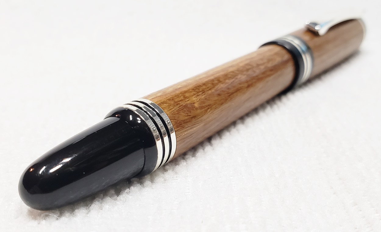 This is a Washington screw cap rollerball, in silver, from Rockler. It is the same as the Berea Churchill, I believe. It's big, the center band is 0.59" in diameter. I love big pens, and wanted to like this one, but it feels cheap to me. When I assembled it, it shaved off some of the plastic from the various parts. But it's not a bad pen overall. I do like it with the lignum vitae.