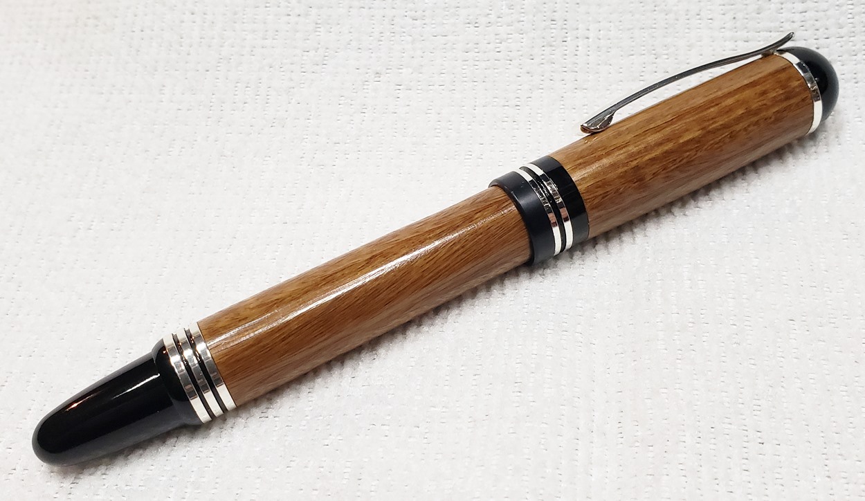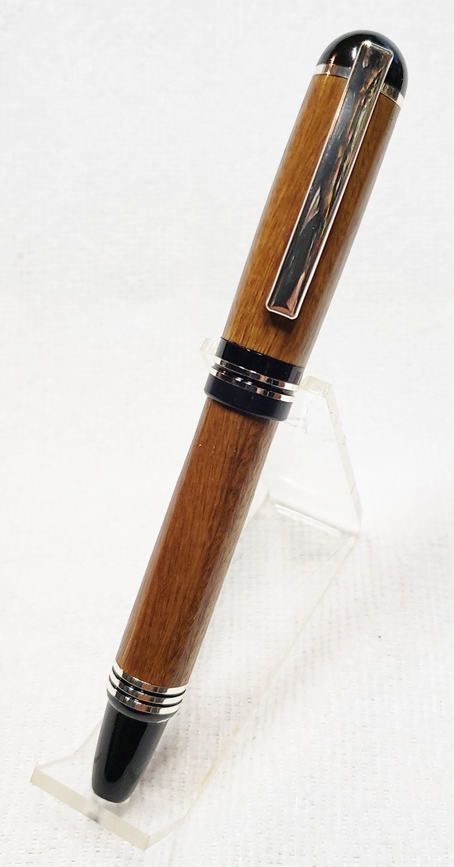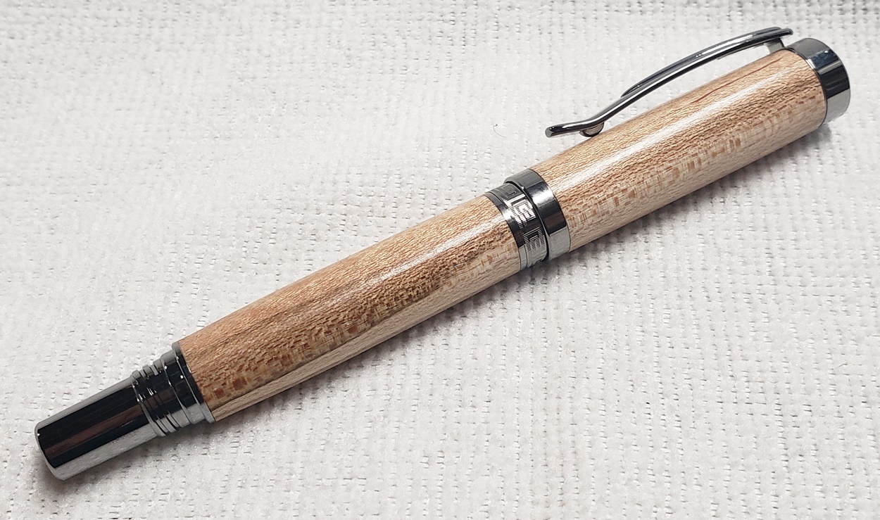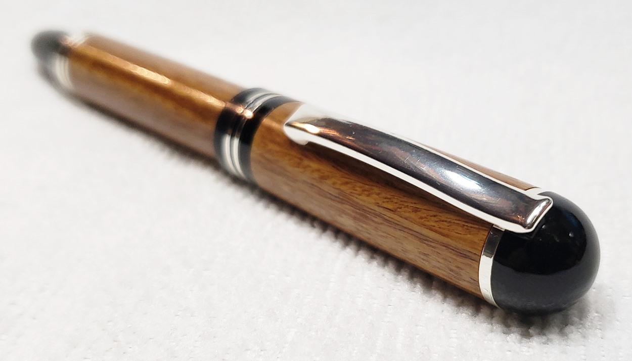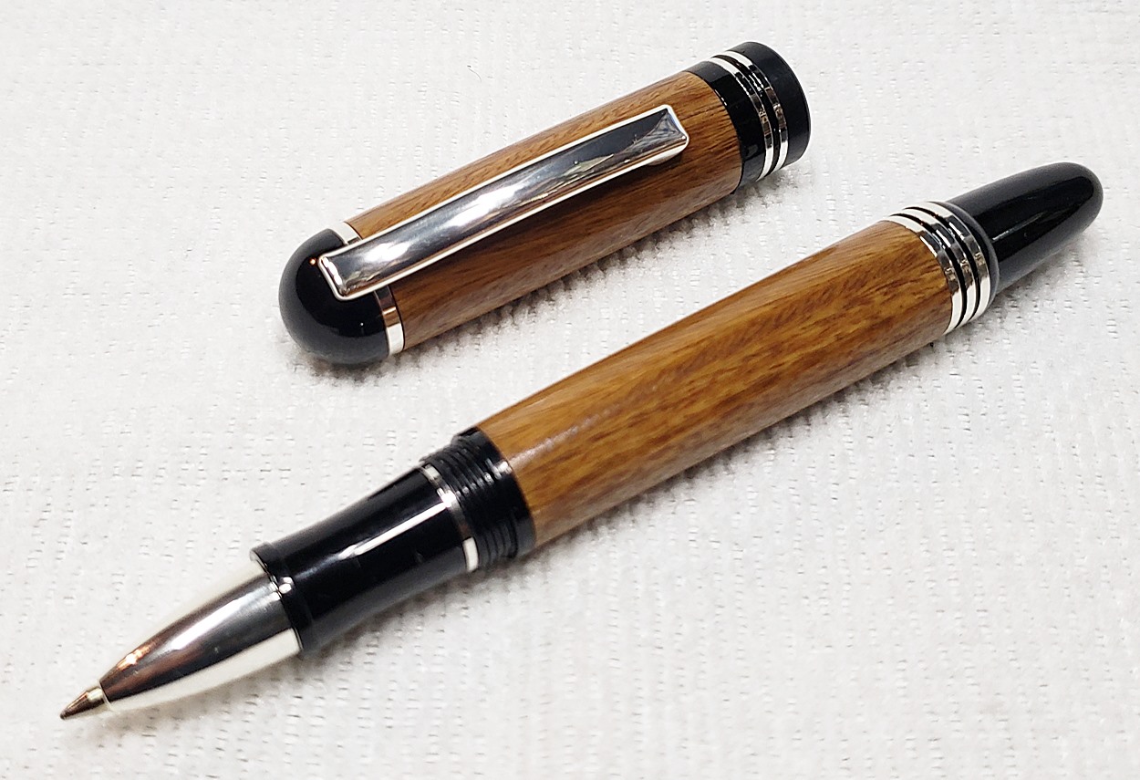 This is a Washington screw cap rollerball, in silver, from Rockler. It is the same as the Berea Churchill, I believe. It's big, the center band is 0.59" in diameter. I love big pens, and wanted to like this one, but it feels cheap to me. When I assembled it, it shaved off some of the plastic from the various parts. But it's not a bad pen overall. I do like it with the lignum vitae.
