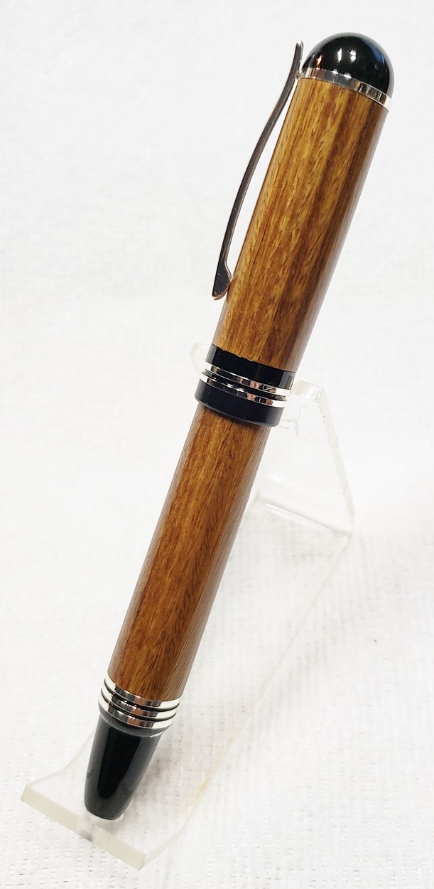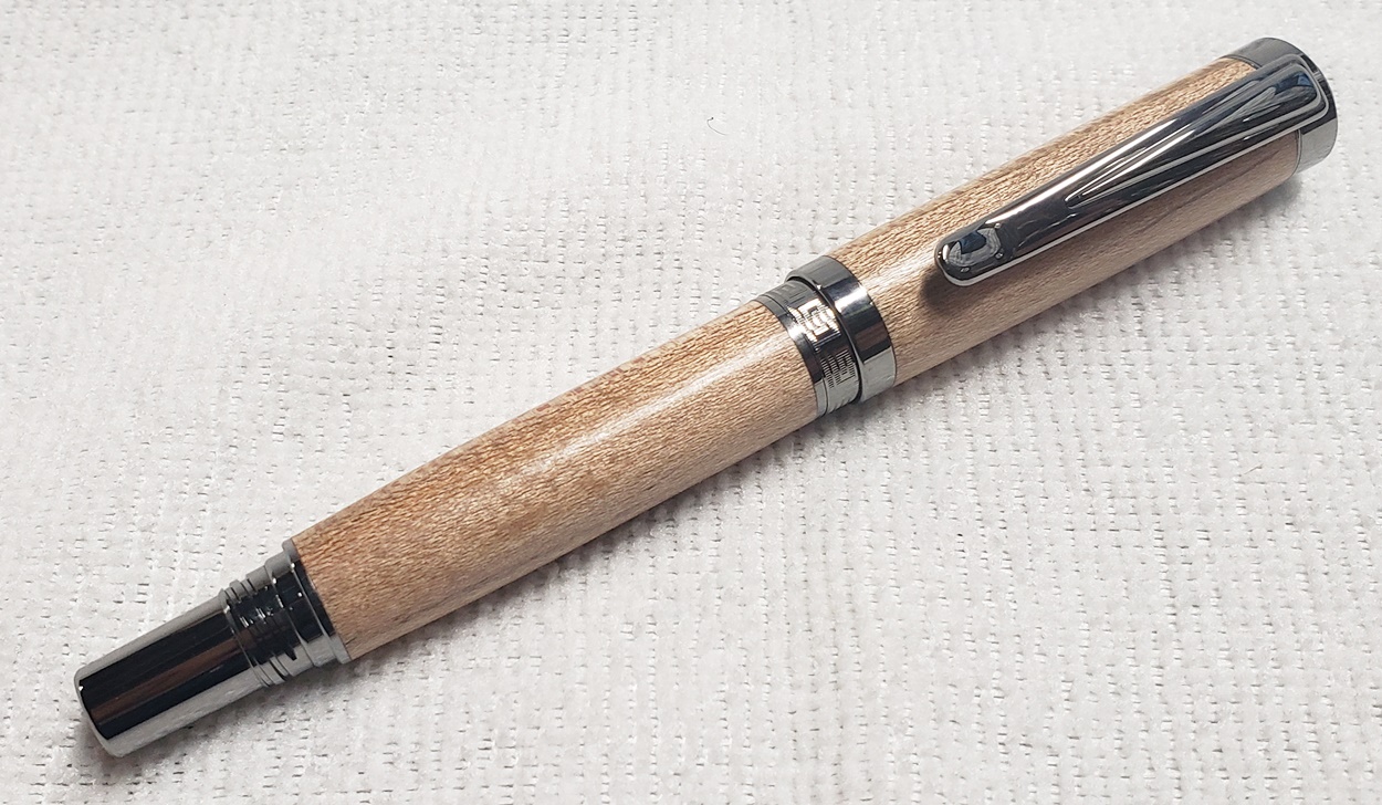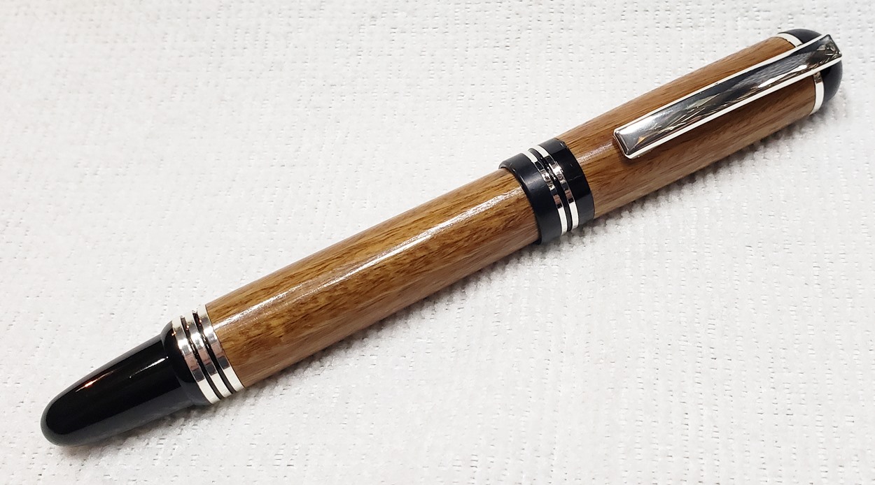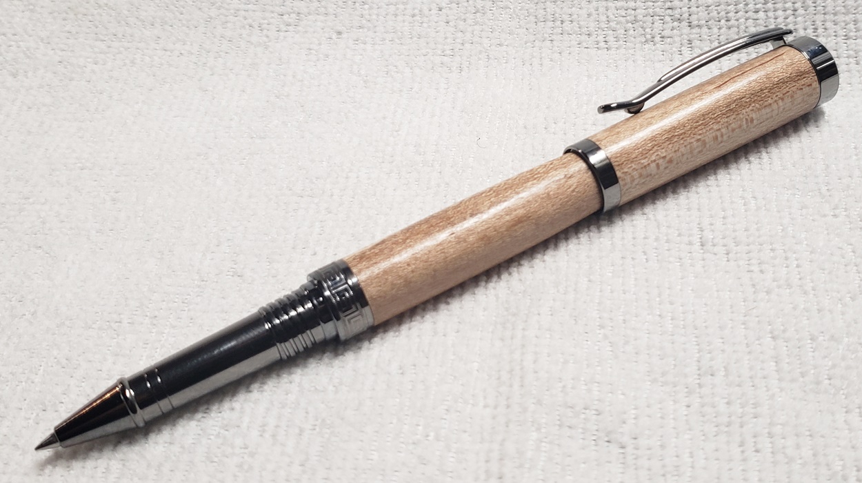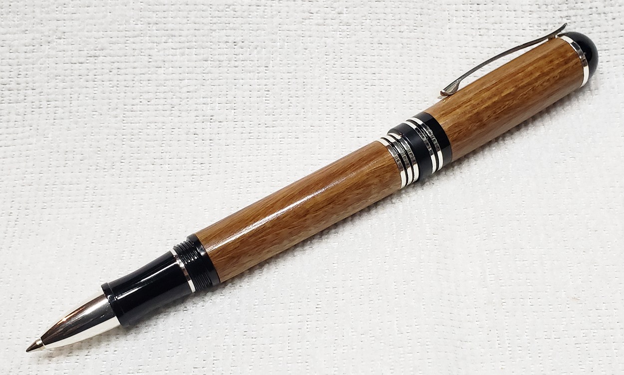 This is a Washington screw cap rollerball, in silver, from Rockler. It is the same as the Berea Churchill, I believe. It's big, the center band is 0.59" in diameter. I love big pens, and wanted to like this one, but it feels cheap to me. When I assembled it, it shaved off some of the plastic from the various parts. But it's not a bad pen overall. I do like it with the lignum vitae.