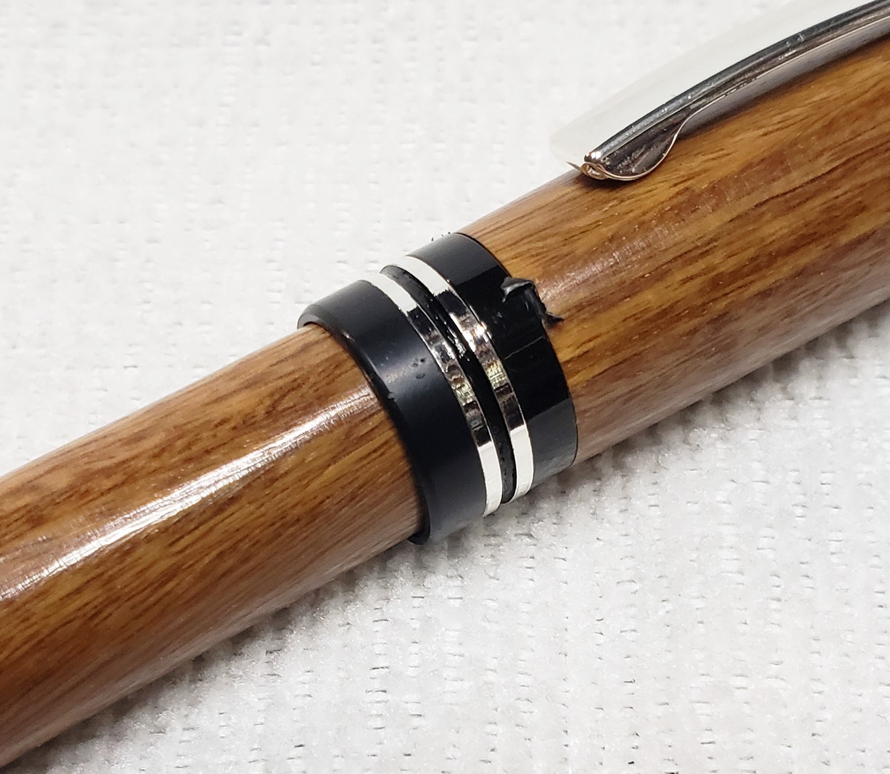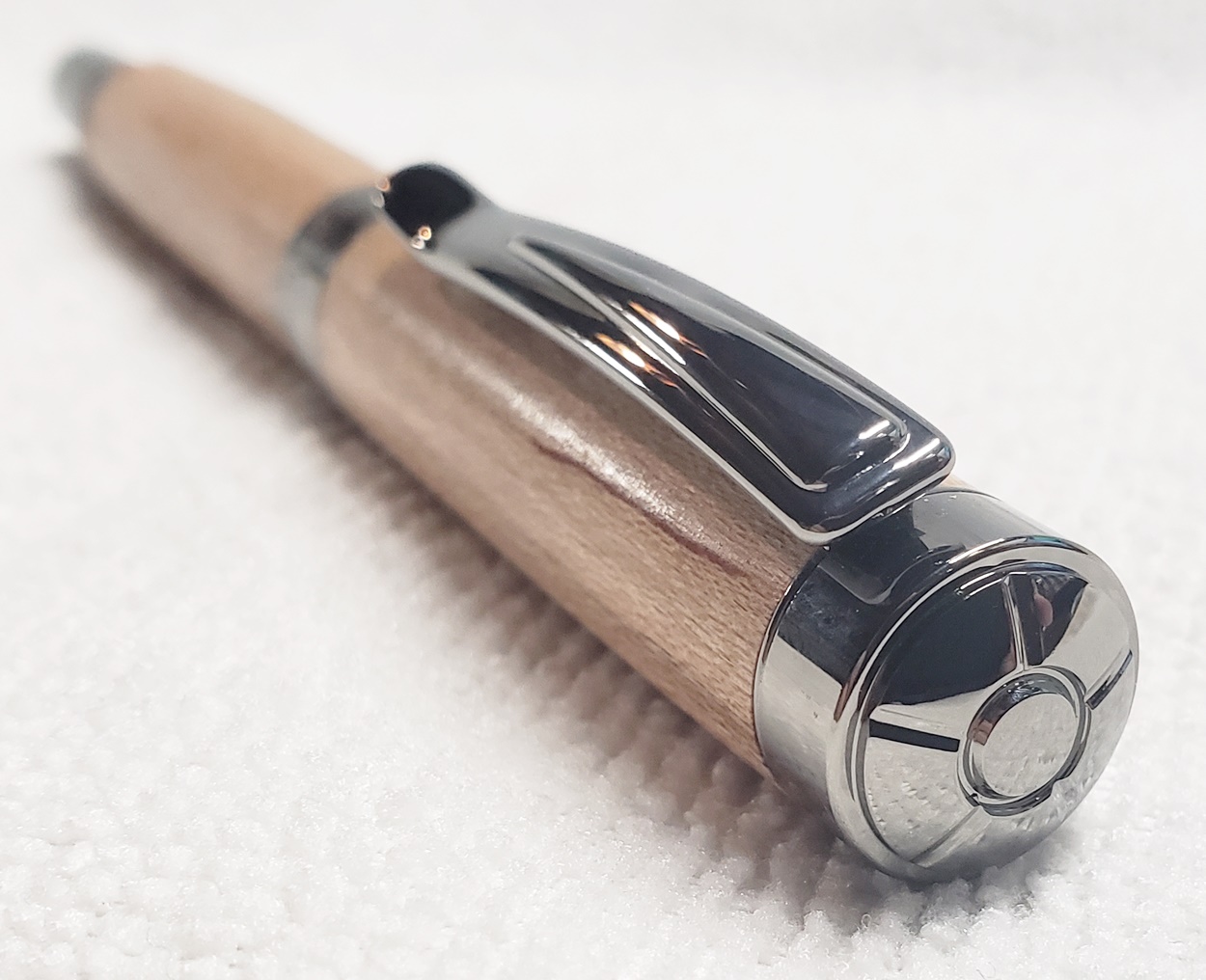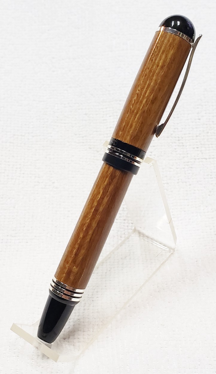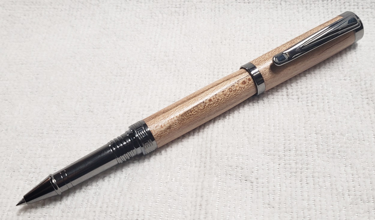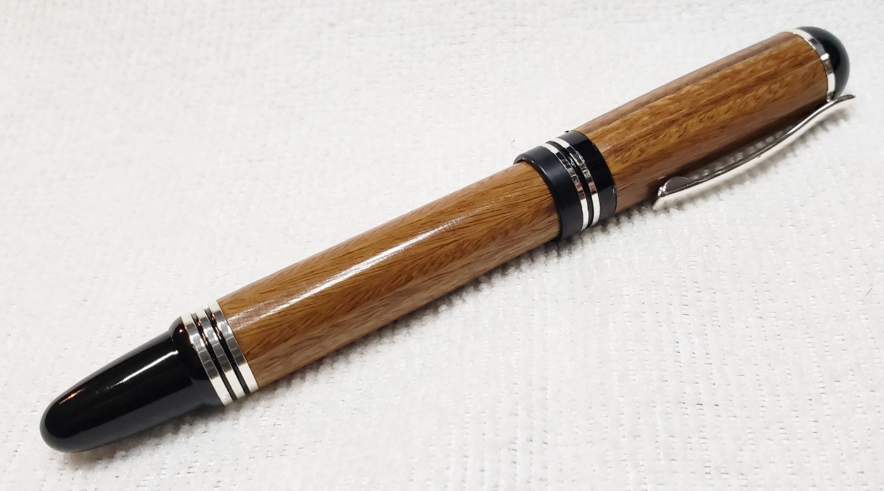 This is a Washington screw cap rollerball, in silver, from Rockler. It is the same as the Berea Churchill, I believe. It's big, the center band is 0.59" in diameter. I love big pens, and wanted to like this one, but it feels cheap to me. When I assembled it, it shaved off some of the plastic from the various parts. But it's not a bad pen overall. I do like it with the lignum vitae.
