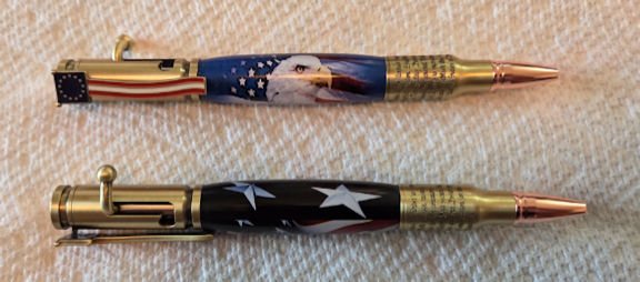 When PSI announced their "We the People" pen kits, I bought the starter kit and several more. This is a .30 Cal Bolt Action pen kit with the preamble to the Constitution engraved on the nib end. The clip represents the Betsy Ross flag. I had a feeling this might be popular with the 250th Anniversary of the Declaration of Independence coming up fast. I wanted some patriotic themed pen blanks to go with them. I also needed a Texas Flag Thin Blue Line blank for my brother.