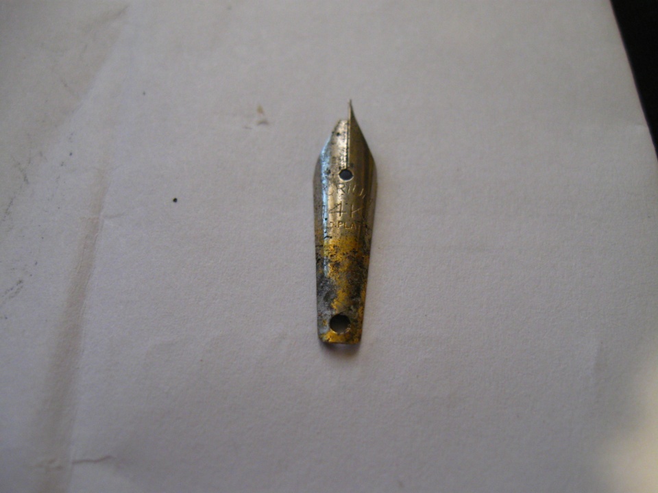 The nib in question (Durium) is a gold plated nib. It's basically lower grade steel plated in very thin gold. Most of these nibs today (decades from when they were released) are corroded from the inside.