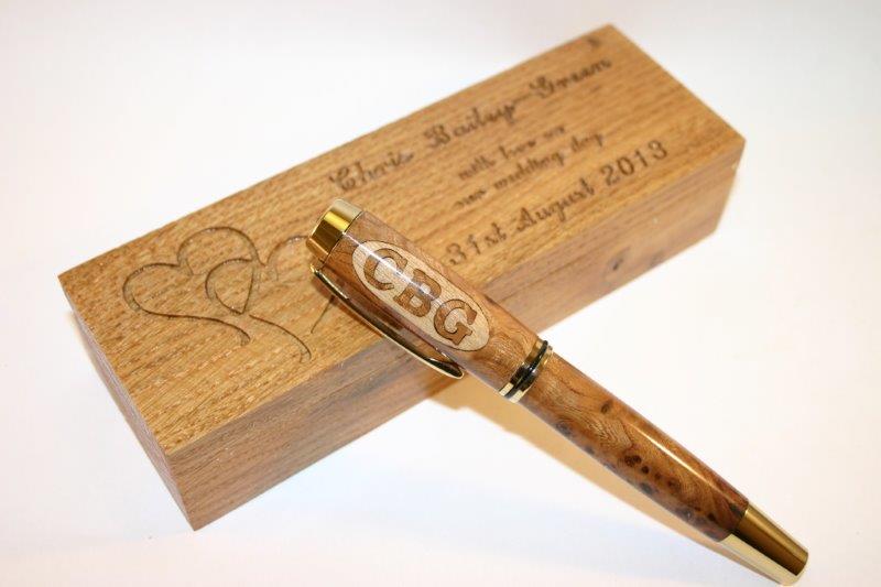 I finally finished a wedding pen commission with the groom's initials on the cap. A lovely piece of burr elm, ash plug for the initials, titanium-plated Gentleman's kit from TB, about 15 coats of CA followed by 0000 steel wool and T-Cut. The box was also ordered - initially the customer wanted all that engraving on the pen barrel! Looks much better on the box ... (If perchance you know the gentleman concerned please keep this quiet until after the 31st of August!!!!)