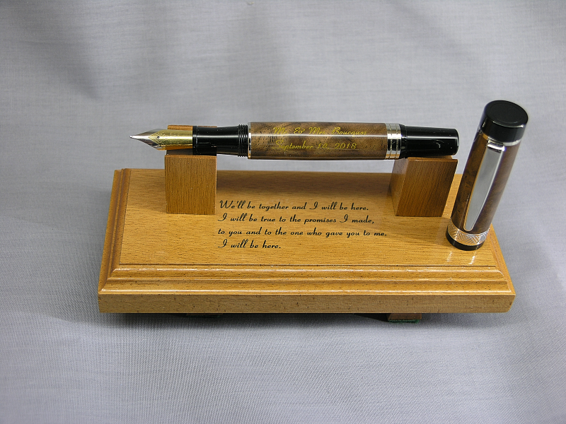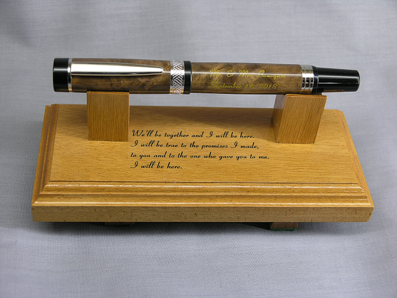 Finished this one yesterday for a young couple in my church that is getting married later this year, the pen is walnut burl on a silver plated El Grande and the stand is cherry. I do a pen for any of the young couples in the church getting married if they want one.