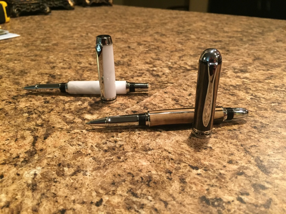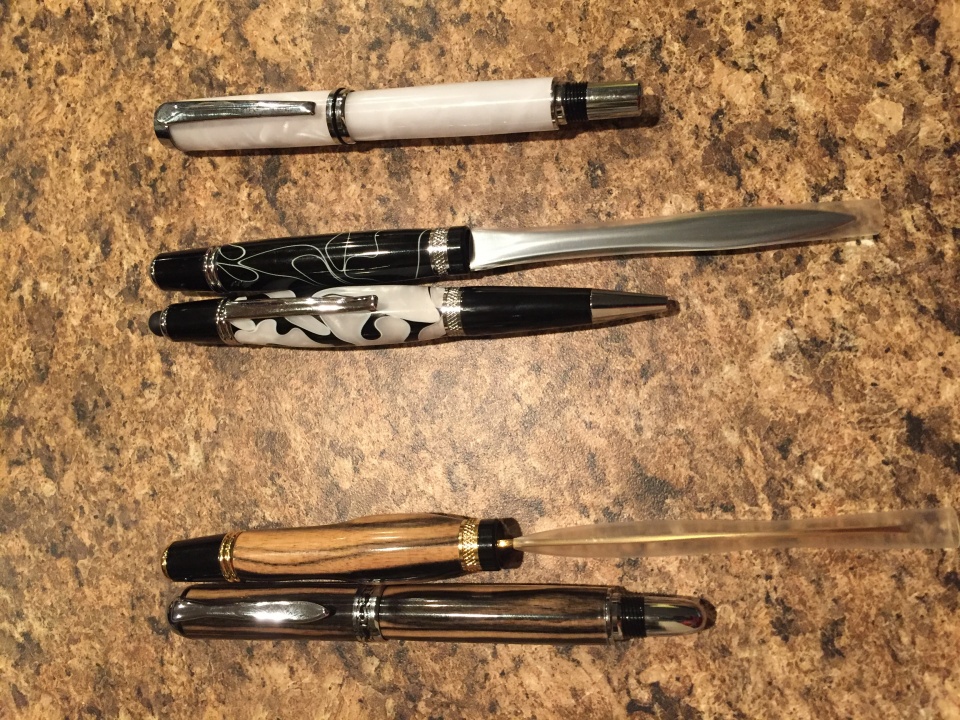 Made a few pens and some letter openers for my brother to give as gifts. A Sedona with black and white ebony, Wall Street II letter opener to match.