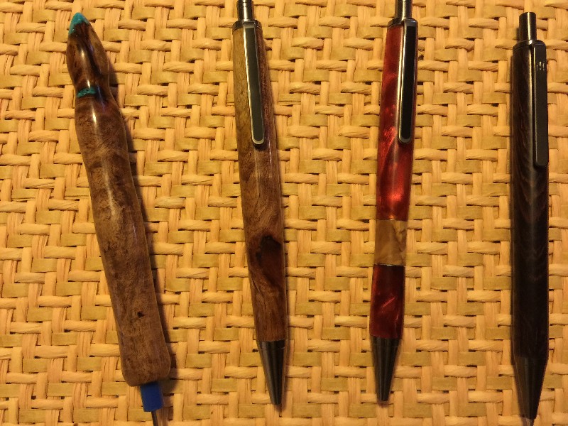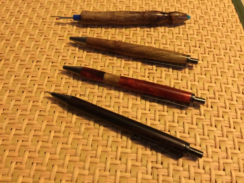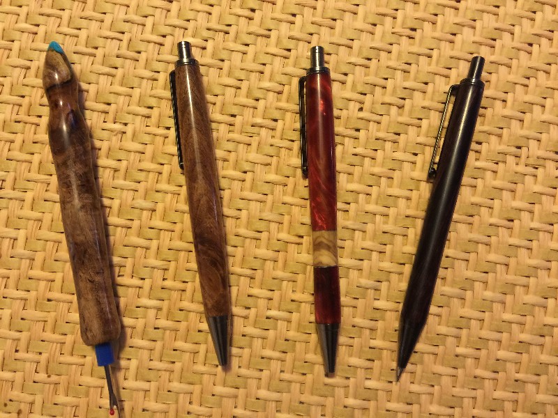 Here is what I made this weekend. 2 modified Slimline Pro Click Pens, 1 Slimline pro Pencil modified and 1 seam ripper. Seam ripper and 1 pen are mesquite. I pen is acrylic with some wood and beer can aluminum segmenting. The pencil is something I received in a PITH and I have no idea what it is. It looks black in the pics but the wood turning off of it was purple.