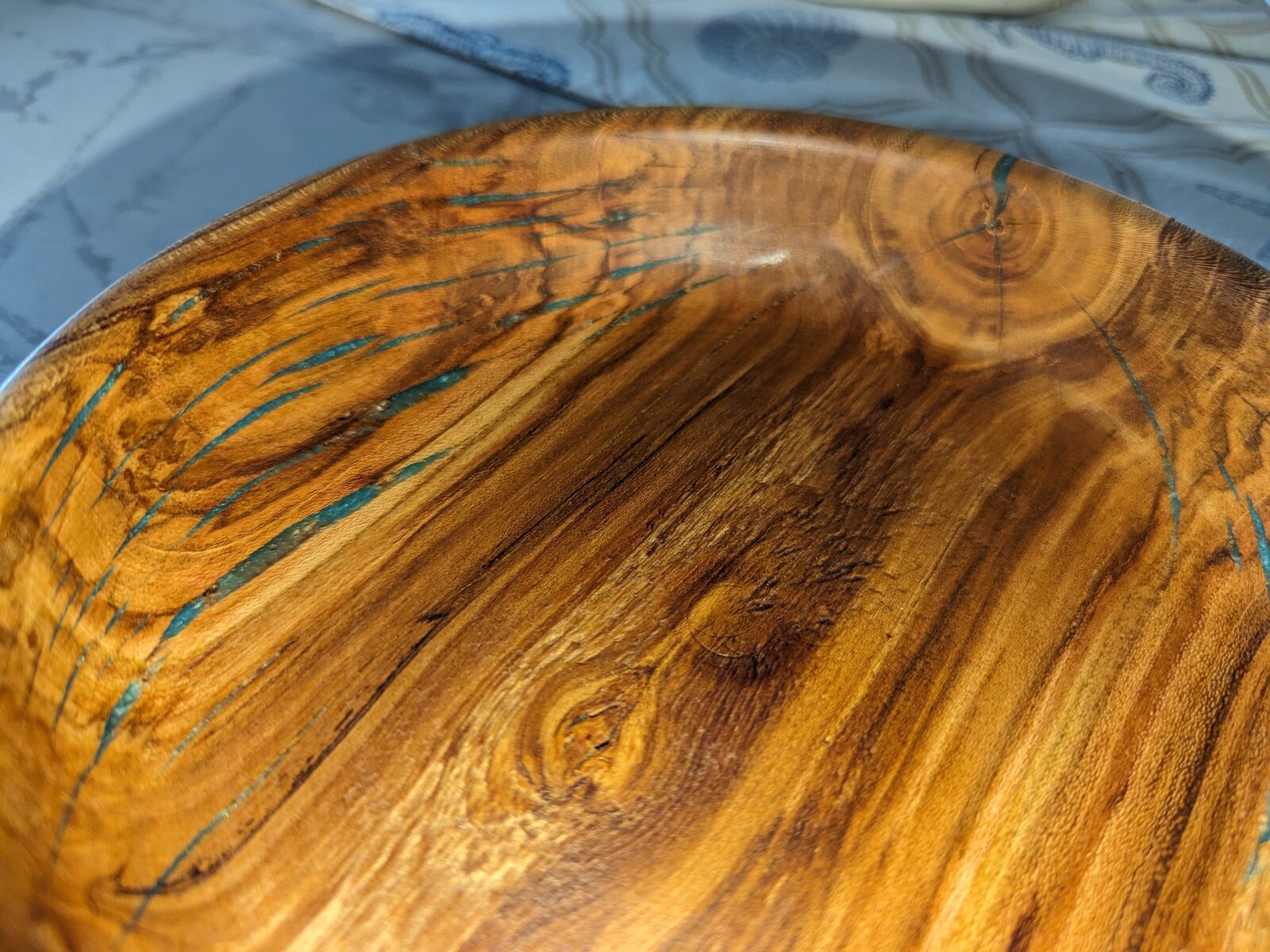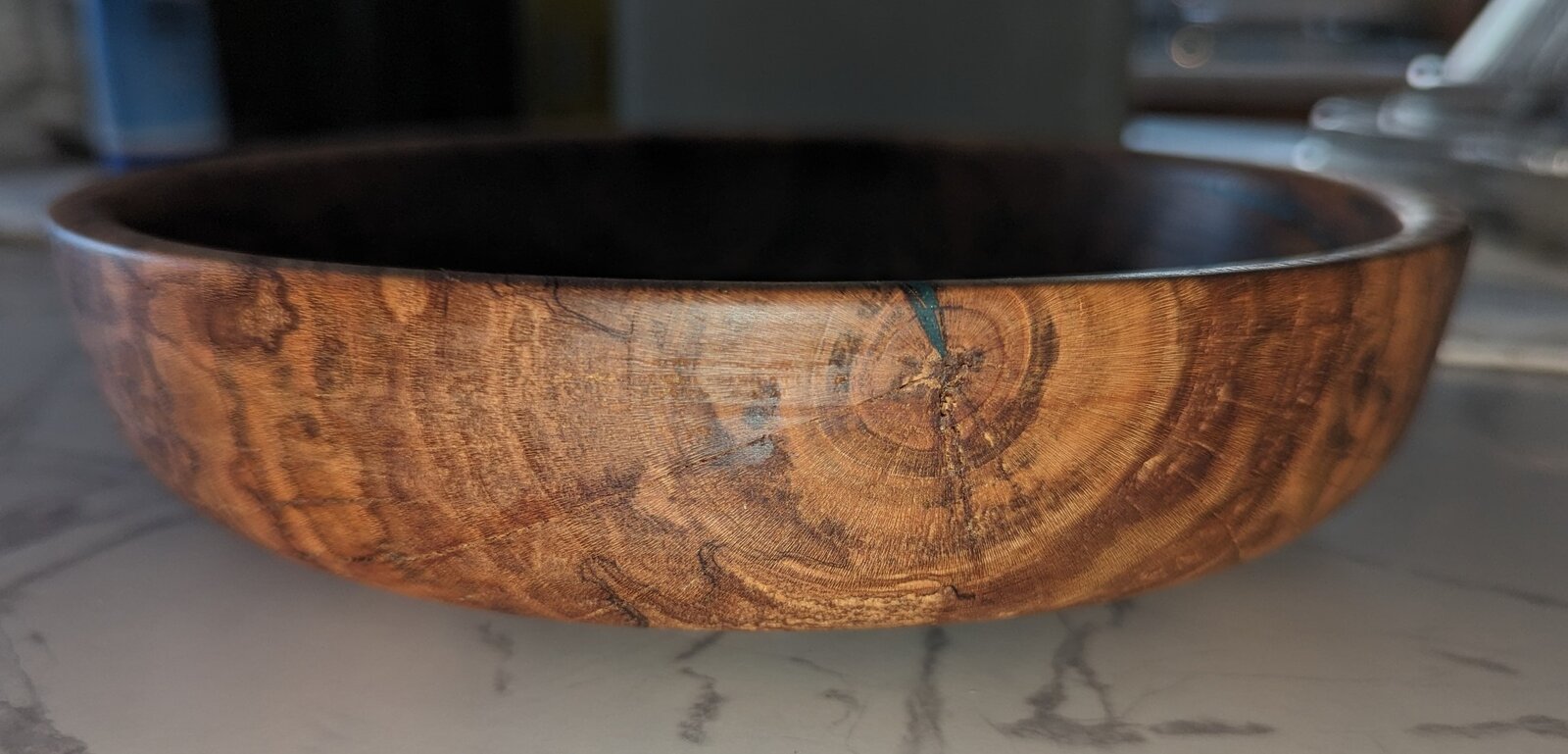 My latest bowl from the Weeping Cherry. This was a blank that was left over from slabbing two side blanks from the center pith. It kept drying out as I was turning it and used blue dyed epoxy to fill the cracks.