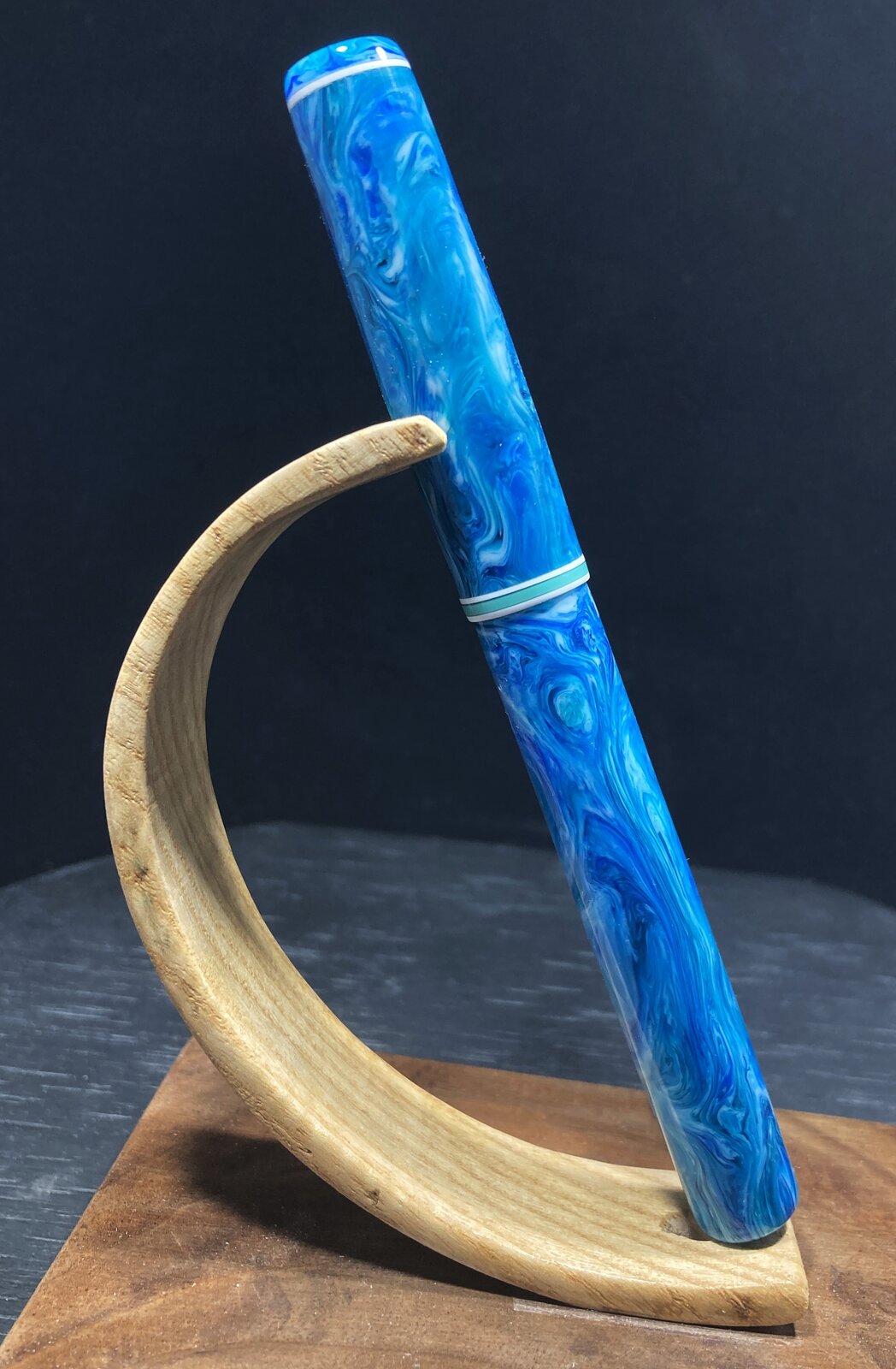 I think I would try to integrate a center band on one of the pieces. Maybe cut a small tenon and then superglue it on. obviously it may be difficult to find something exact, but you could use something like black Corian or maybe a cutoff of another kitless blank. That way, you could turn to the exact dimensions you need.