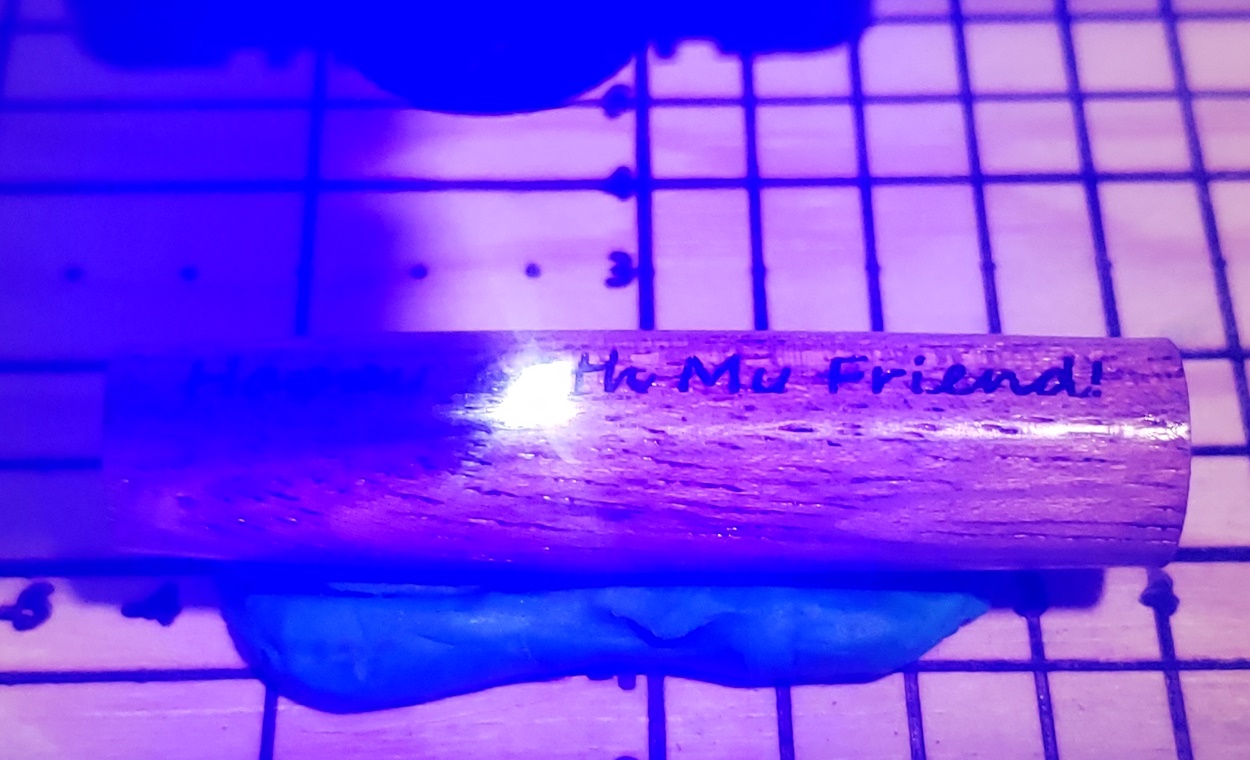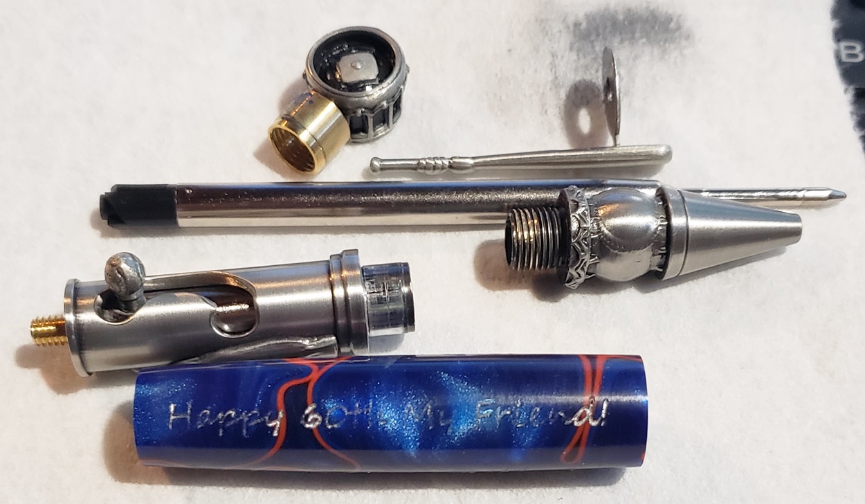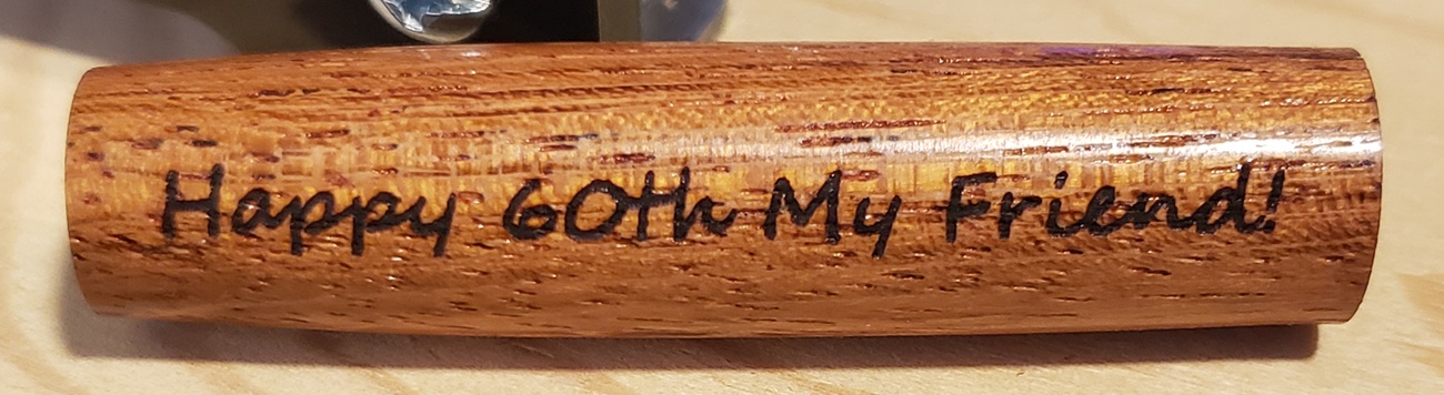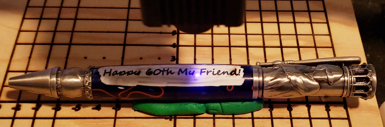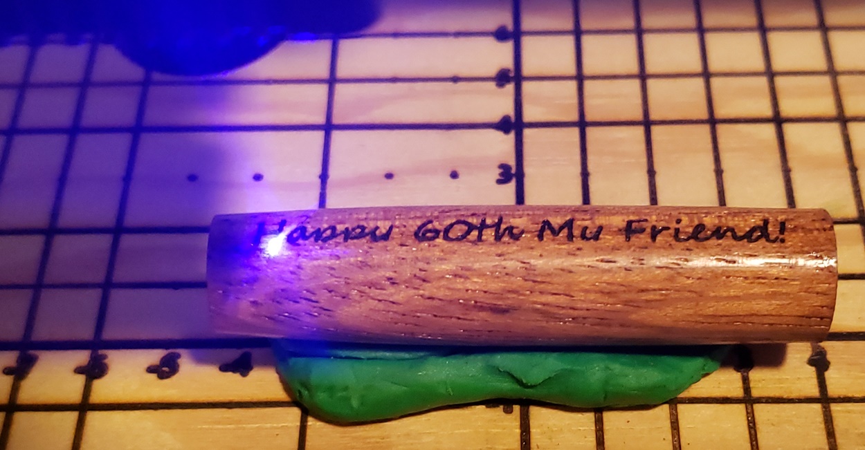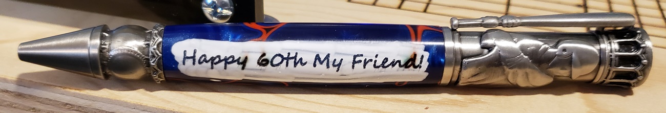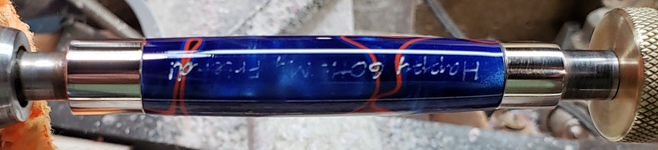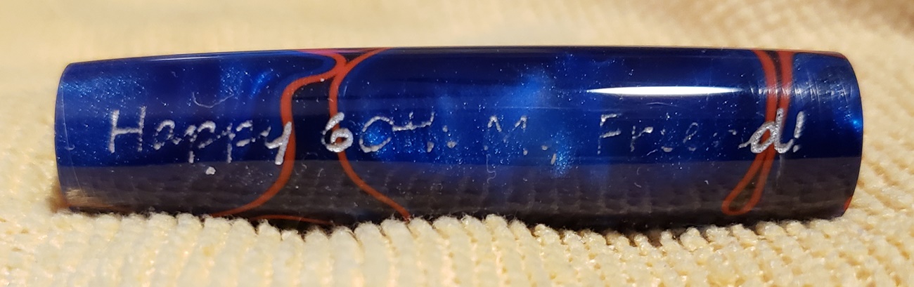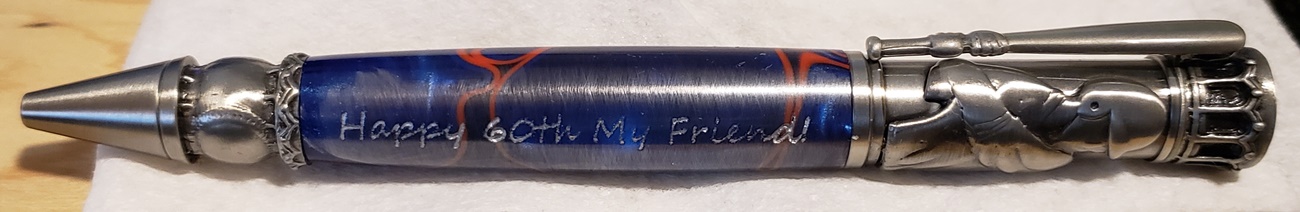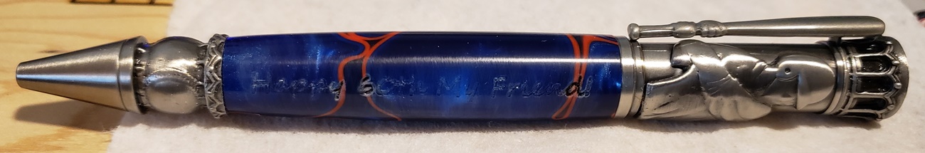 I made a baseball pen for my friend's 60th birthday. I actually turned and finished it before I got my laser engraver. I finally got around to engraving it yesterday. The engraving turned out good. Someone on the MEJE Master engravers Facebook group recommended covering it with liquid chalk, which worked well. But like most acrylic pens, the engraving needs to be filled to show up well. So I used silver Rub'n Buff, as I have in the past. My friend doesn't like shiny pens, so I had wet sanded it to 600 grit, and didn't polish it further. Unfortunately, the micro scratches picked up the Rub'n Buff. Even lighter fluid wouldn't clean it.