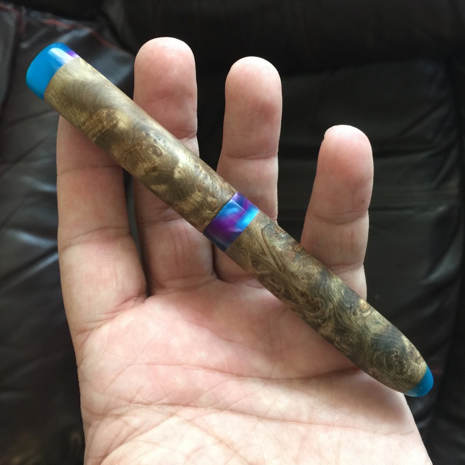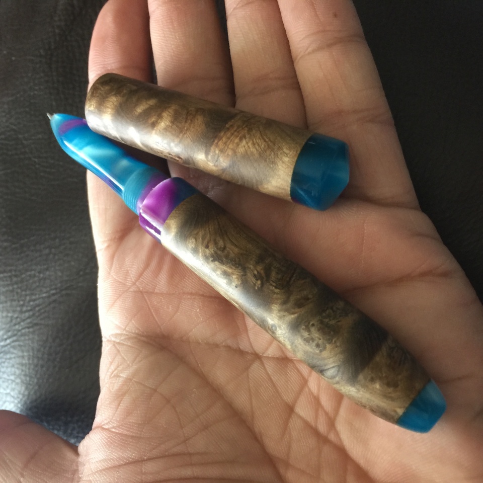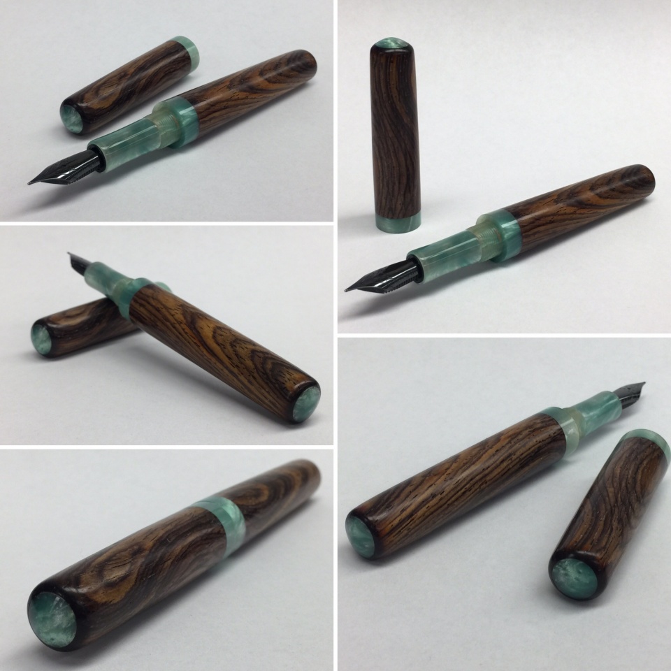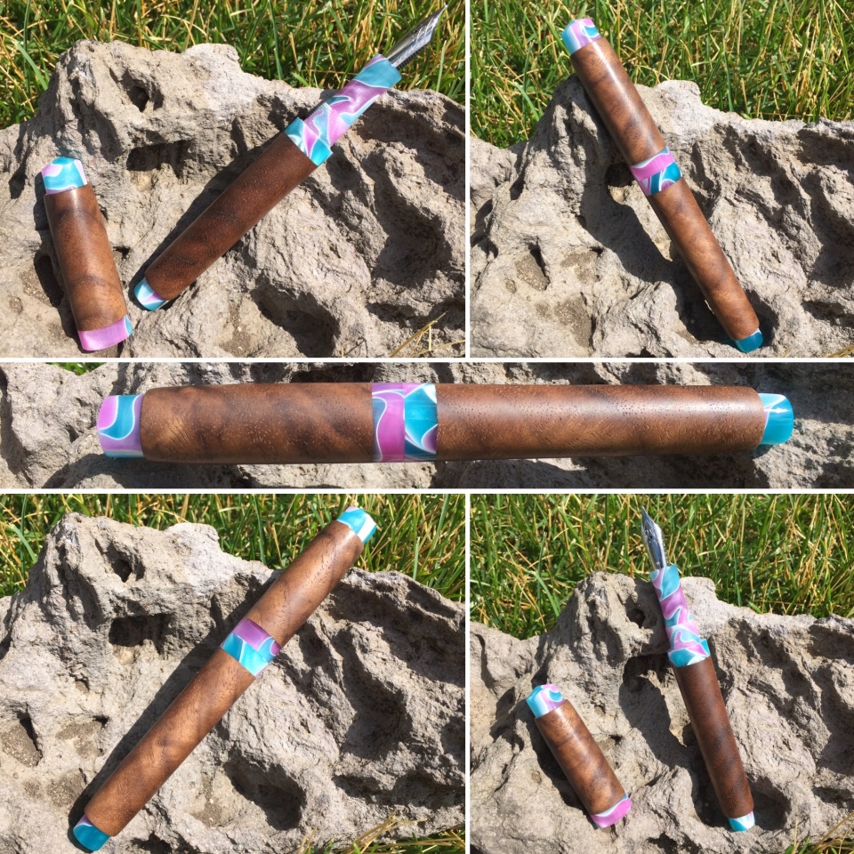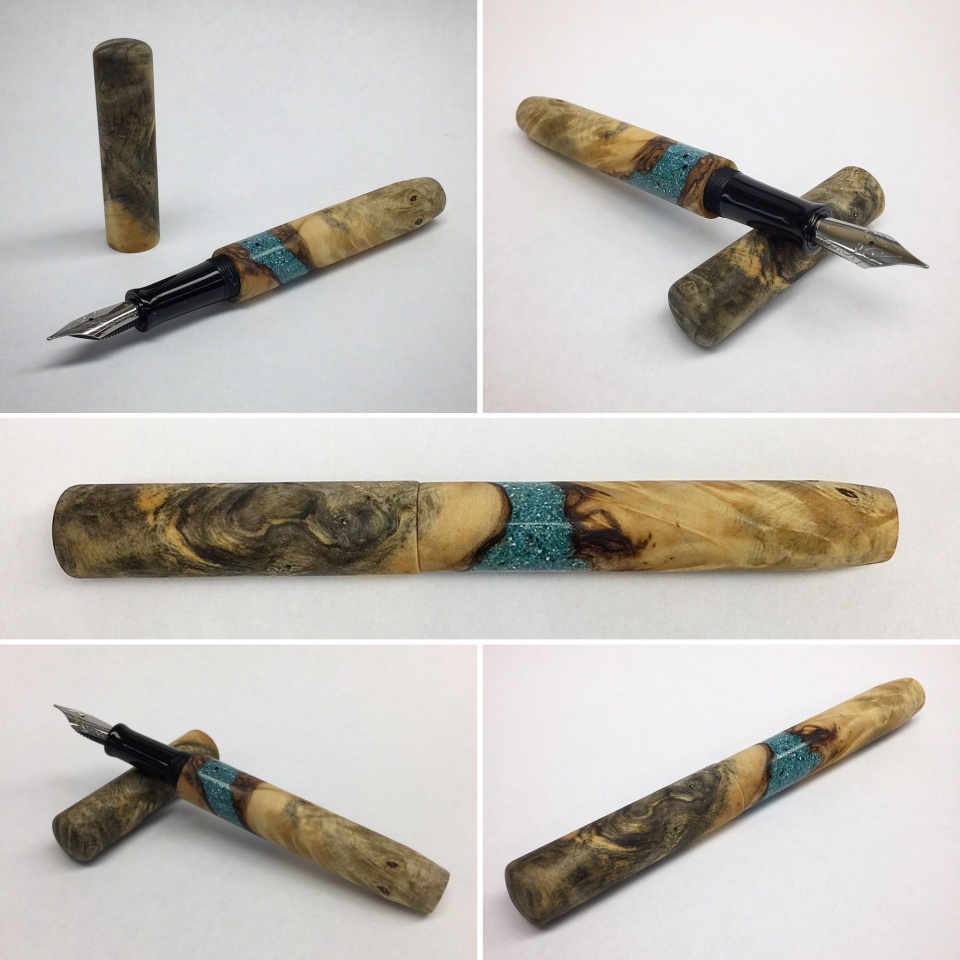 Two more recently finished pens. Jowo #6 fountain pen with buckeye burl and inlayed crushed turquoise. Pen features a smooth satin finish, with the turquoise section being polished to a high gloss for contrast, and a glossy acrylic section grip. Second pen is designed to accommodate a Pilot G-2 ballpoint refill, features a turbulent waters acrylic nosecone, connector and finials, with Asian Satinwood Burl barrel and cap bodies.