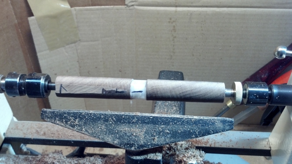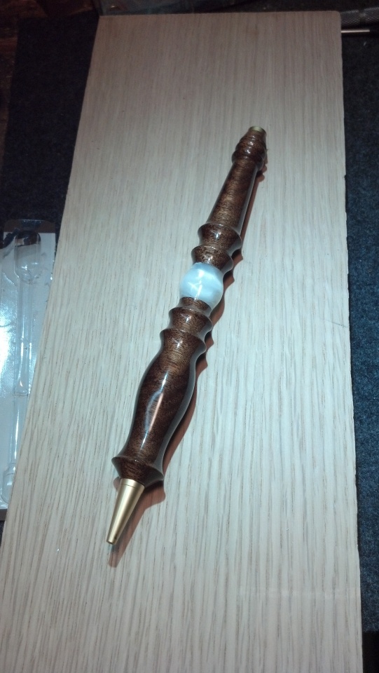 BIG PENS..... I call it "The Whopper". This one is a desk pen I did for me. Cross cut walnut with a white gold veined acrylic ball in the middle. Measures 7.25" stem to stern and is a one piece. Took up the entire mandrel. Writes nice, very light, and has good balance. I'll use this when I write big checks..... :smile: