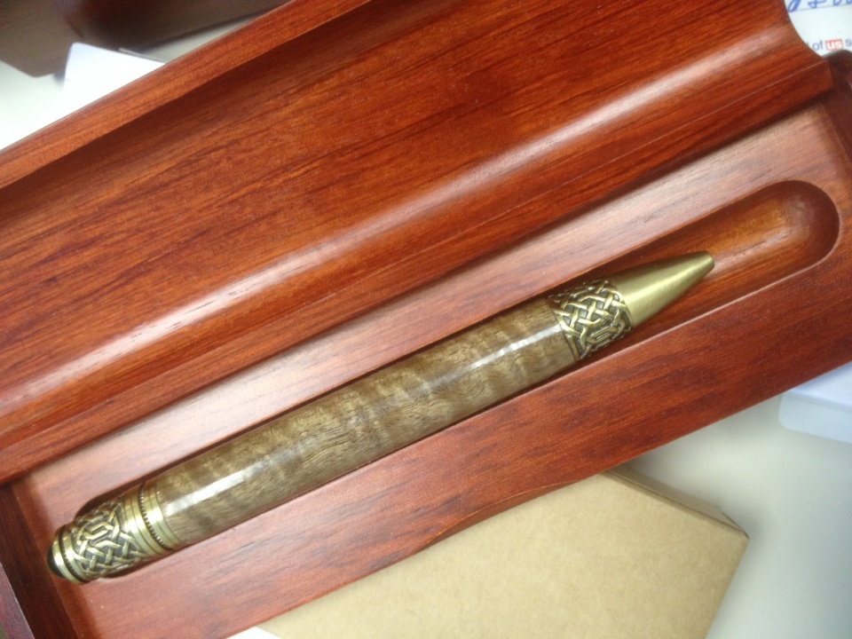 This is a Celtic pen made from a blank that I receive from Edohman. It was marked as unknown and, Murphy's Law, was the first one from the set that I turned. I like how it came out but am still none the wiser on what the wood is. It does have a greenish tinge to it rather like some poplar but the grain is more interesting.