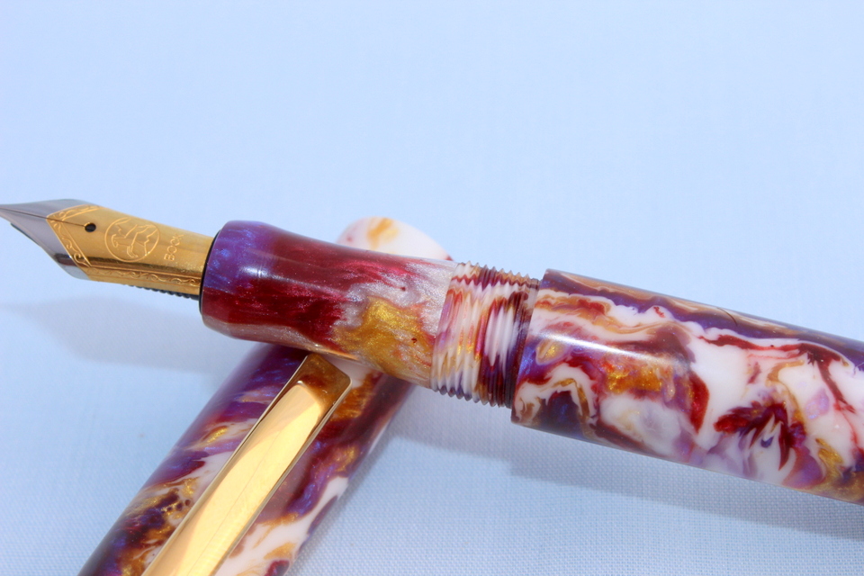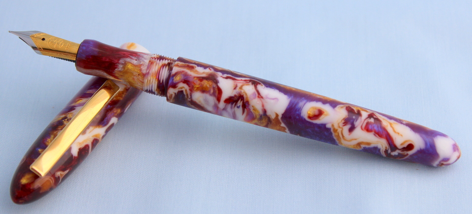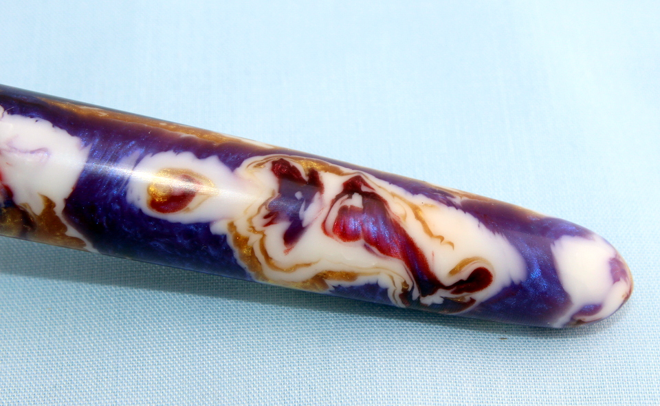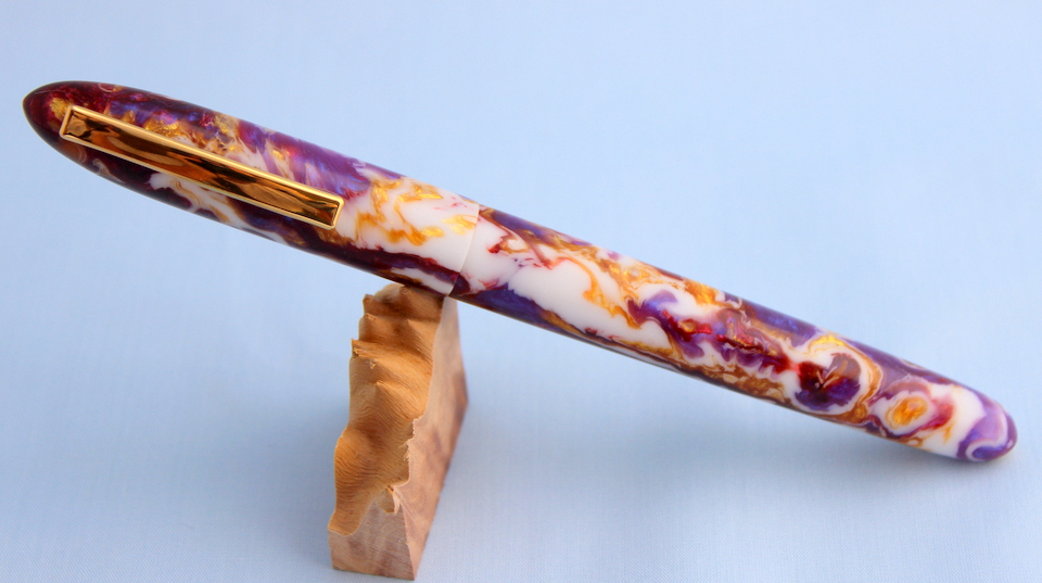 When I made this pen my wife immediately said that it looked like a Versace. I have no idea what a Versace is and can't find it in the dictionary! Anyway, this is a four color Alumilite pour made into a kitless FP with a #6 Bock nib. I guess it started my "Versace inspired" blanks. Thanks for looking, C&C welcome, Evan