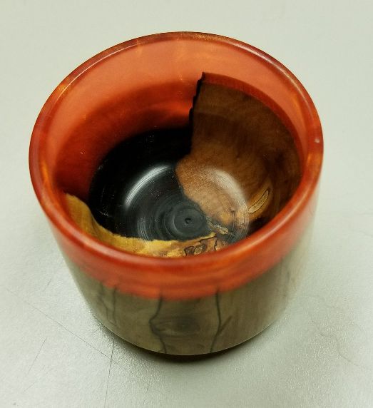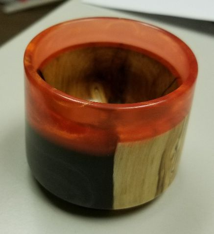 I keep a mold handy for using up left over resin. This is my latest. The black resin I had left over didn't quite fill the mold, so I cured it at an angle, then when I had more of another color I poured it on top.