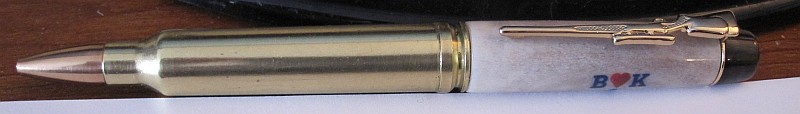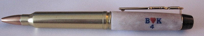 I made this bullet pen for a charity auction. I put the charity logo on it with a decal. I have the pen temporarilty assembled (still needs epoxy).