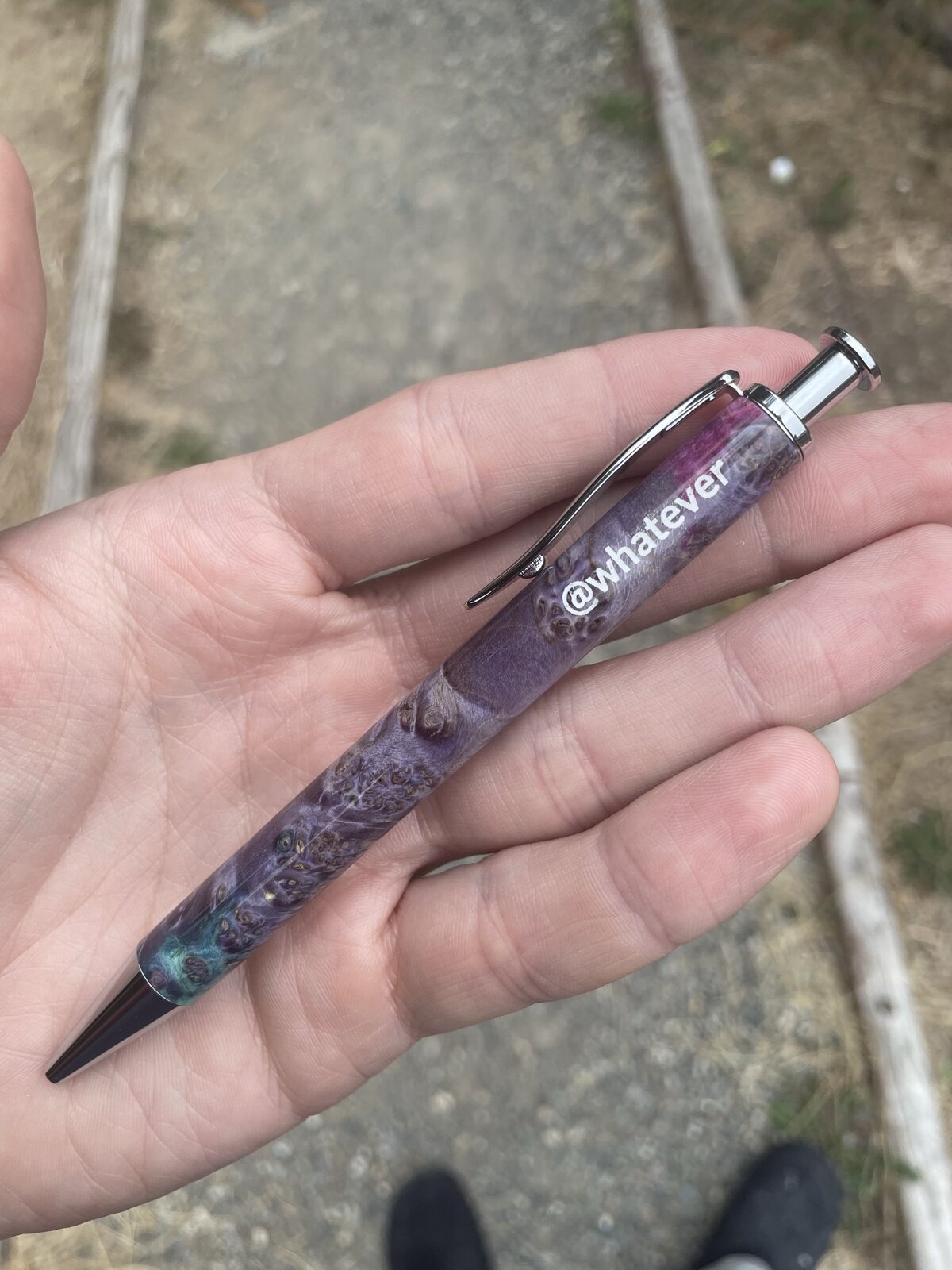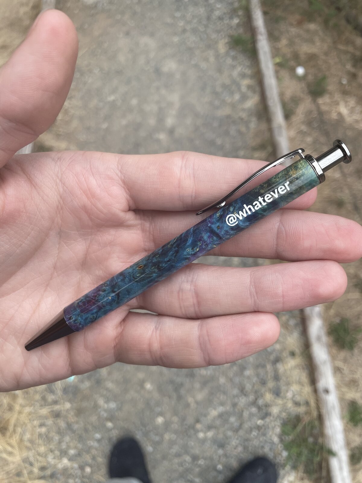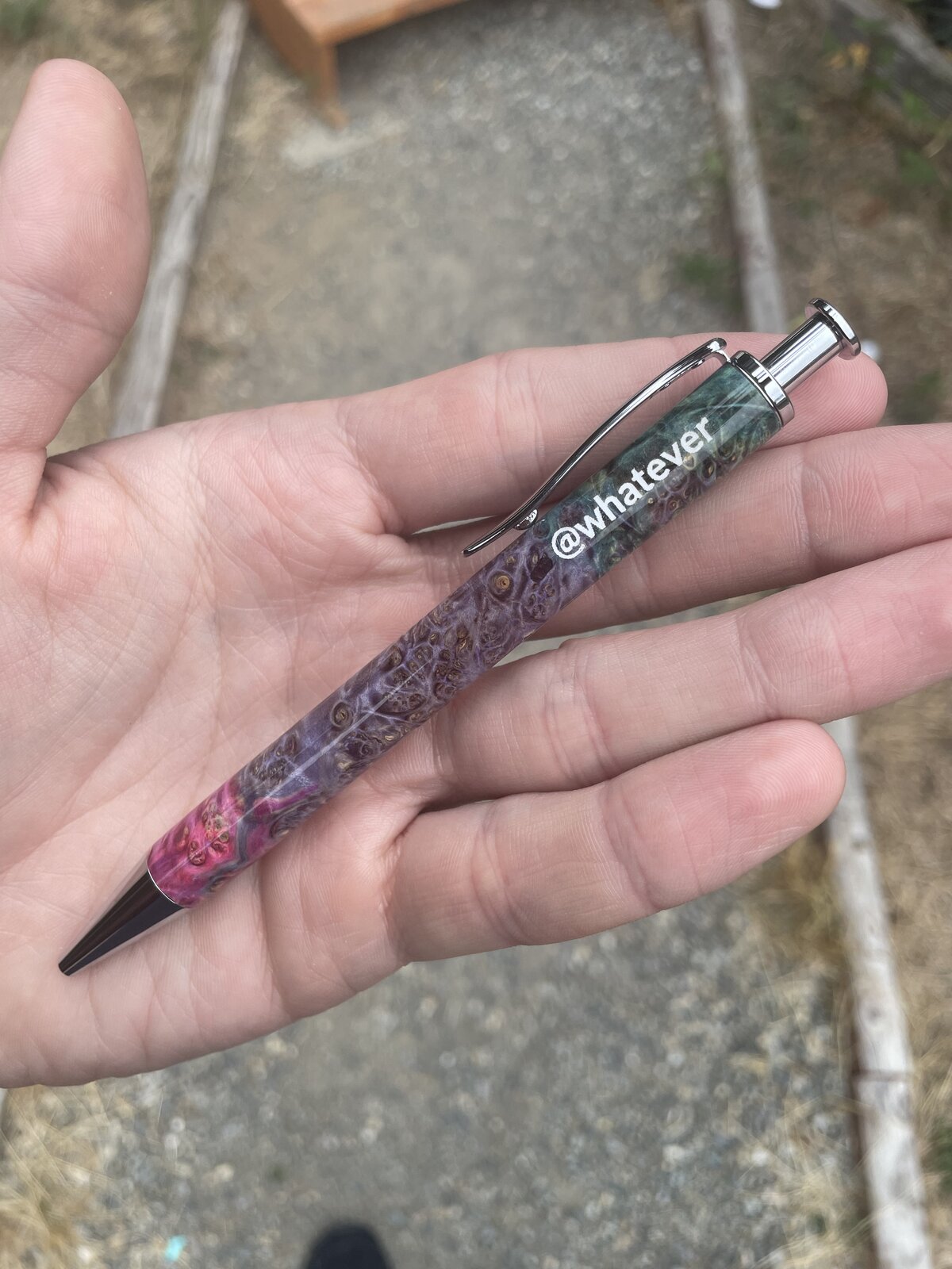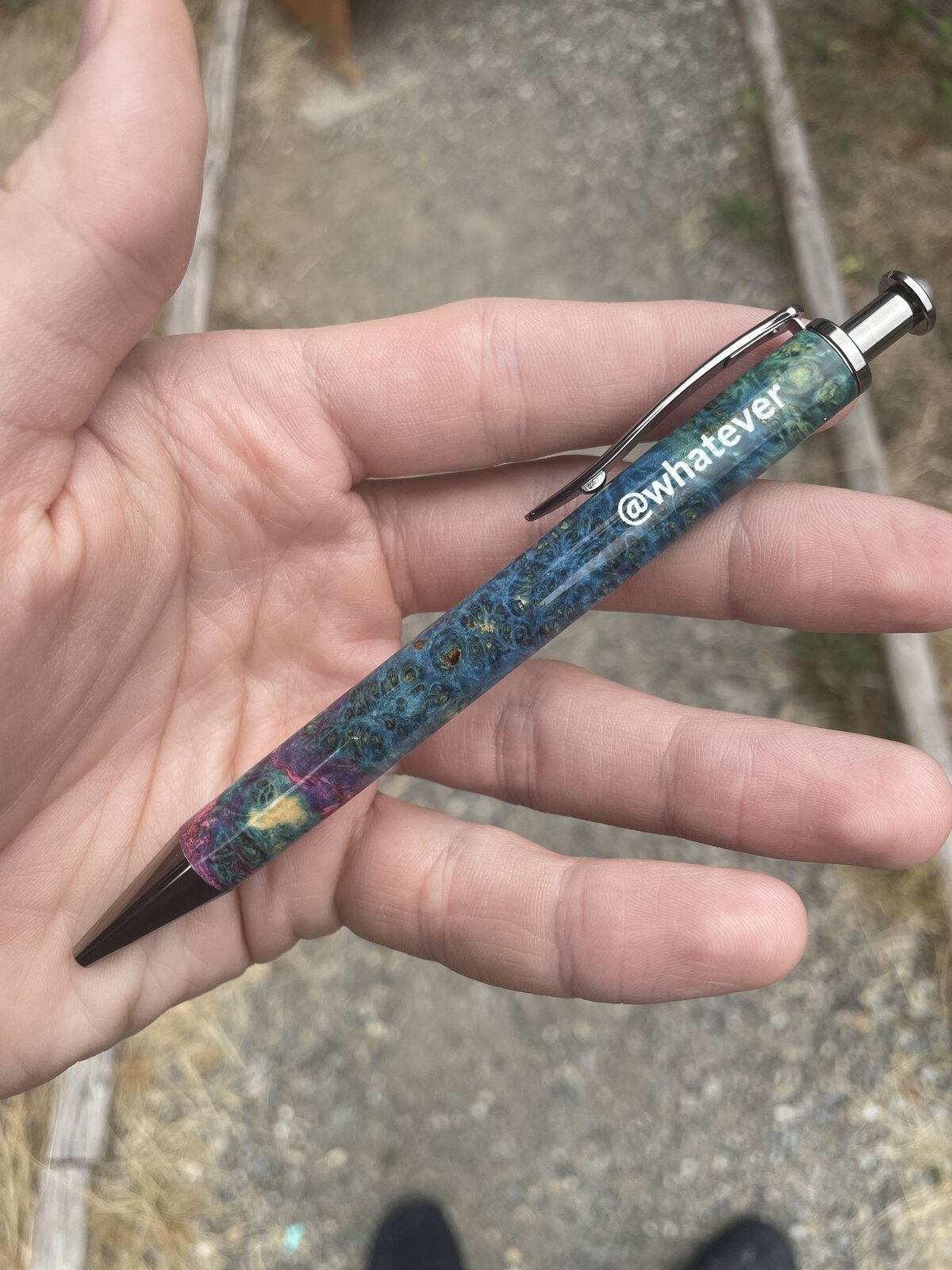 Pens commissioned for a business, engraved with their logo. All blanks are dyed maple burl from @Benpen, on black ti and chrome long clickers from Dawn and @ed4copies at ExoticBlanks. This wood is really something else.