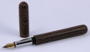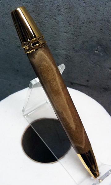 This one might be mine. Spiral cut Olivewood in a titanium desk set. The base is weighted and the barrel is splined to spin when the pen is set in the base.