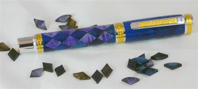 Thanks Darrin. That is exactly now it was done. I did not cut the diamond pieces myself. I drilled and preturned the blue and purple blanks and sent them to Ken Nelsen at http://www.kallenshaanwoods.com and he cut the pieces for me. I then glued the diamonds to the tube and finished turning the pen. Contact Ken if you want to do one and I'm sure he will help you out. Mention this pen and he will remember...he probably will anyway. We had fun figuring out how to best do this. The pen was a special request from a customer. I will be doing more of these in other colors.