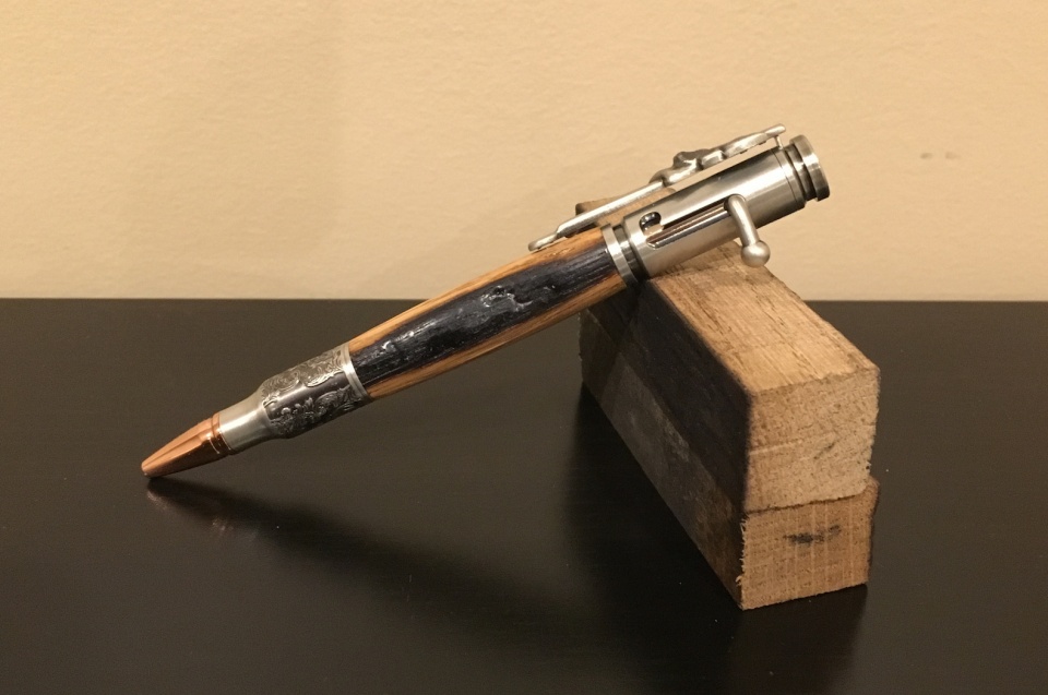 So, here's one of the two Jack Daniels pens I'll be sending him as soon as I make a custom case. The pen kit is the antique pewter "Deer Hunter" from Penn State and I'll swap out the kit's ink for Schmidt Easy Flow 9000 refills.