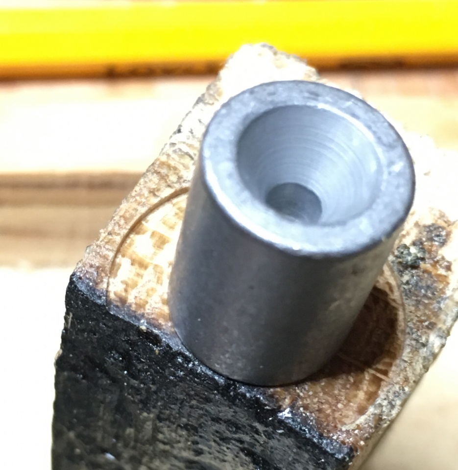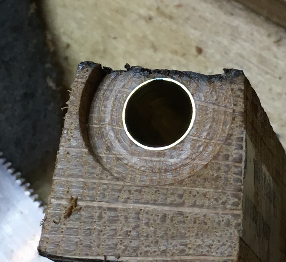 The black stripe is original charred surface from the inside of the barrel stave this blank came from! Drilling a 3/8" diameter hole that close to the edge was uneventful (I truly expected to blow out the side during drilling).