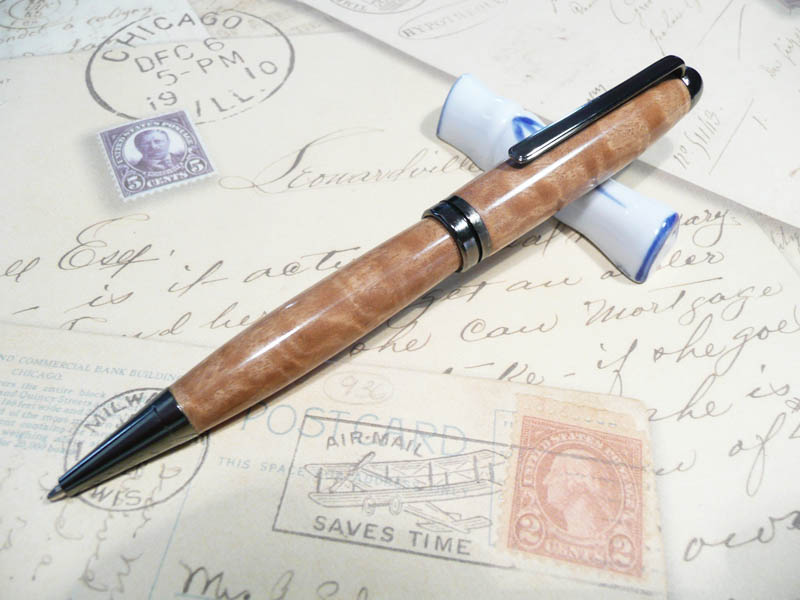 A gun metal European in curly white mahogany. The finish is 6 coats on Minwax wipe on poly, Autosol and Plastic X