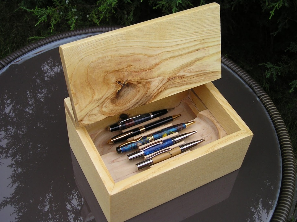 ASH PEN CASE Here's another case on the small side but can hold many pens due to the "multiple" floor stacking system. Barrel hinges were used for the lid.